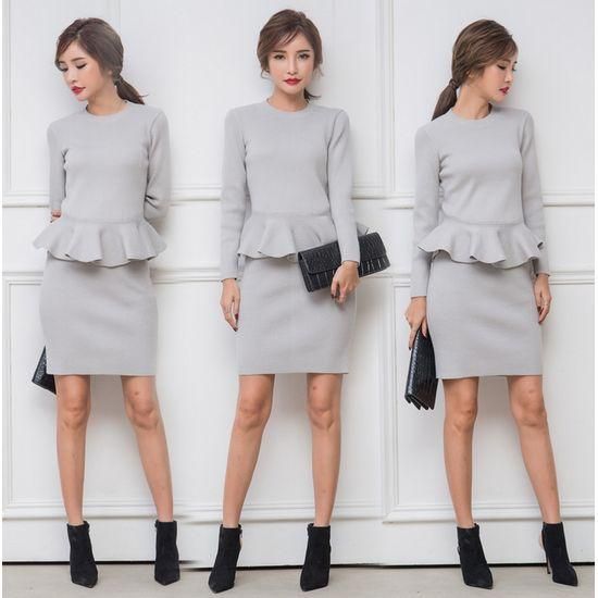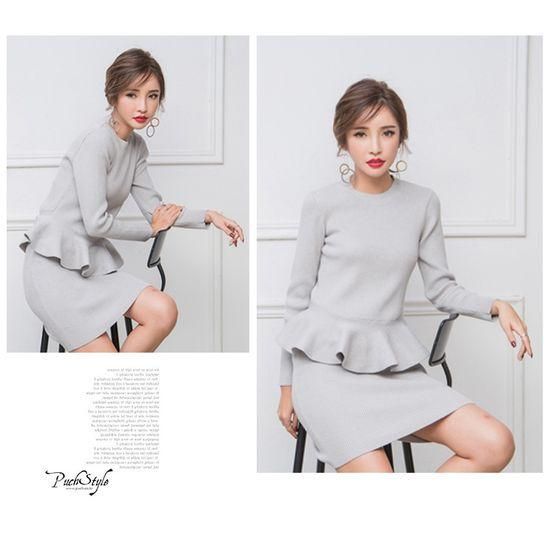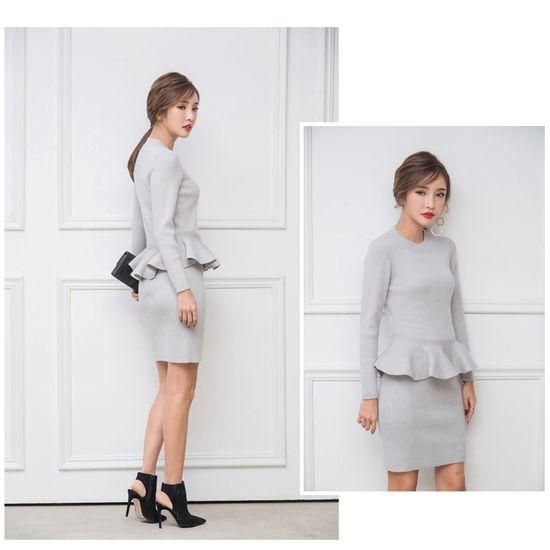 ぺプラムデザインが女性らしさを引き立てる長袖ブラウス&タイトスカートのセットです。