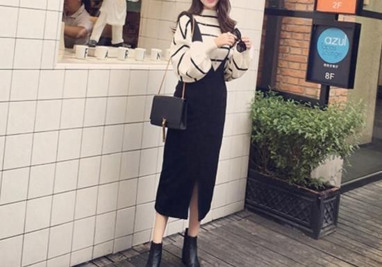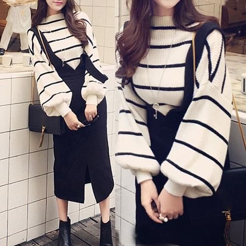 リゾート セットアップ コーデ 長袖 ボーダー ニット ミモレ丈 サロペットスカート