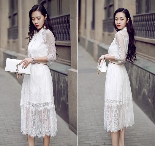 リゾート ワンピース ミモレ丈 コーデ 結婚式 ウェディング ゲスト ドレス レース シースルー 前開き シャツワンピ 大人 七分袖 /黒/白