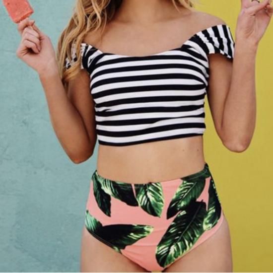 リゾート 旅行 水着 スイムウェア ビキニ オフショルダー ハイウエスト ボーダー ボタニカル ミックスマッチ 上下別柄