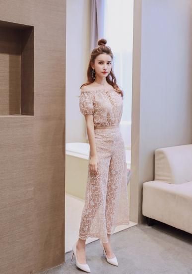 ヌーディーなレースが大人かわいい♪オフショルトップス&ワイドパンツ セットアップ