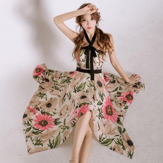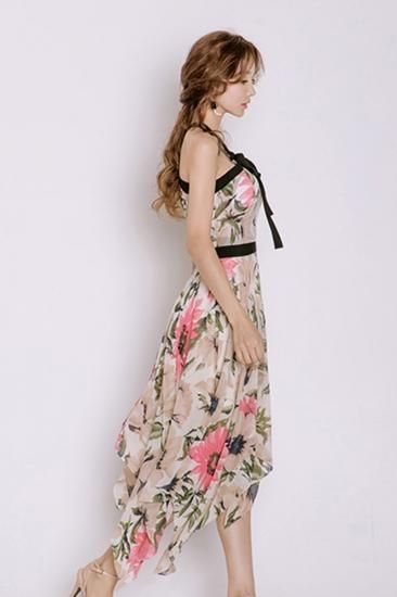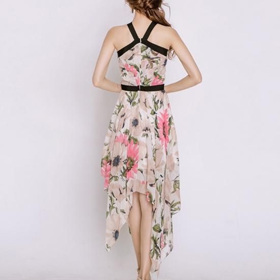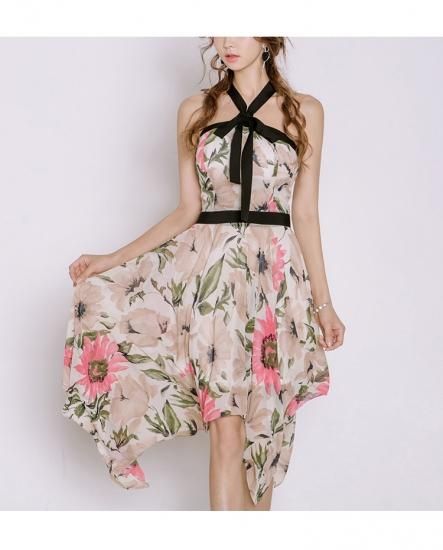 イレギュラーヘムがかわいい♪ホルターネック風 花柄シフォンワンピース