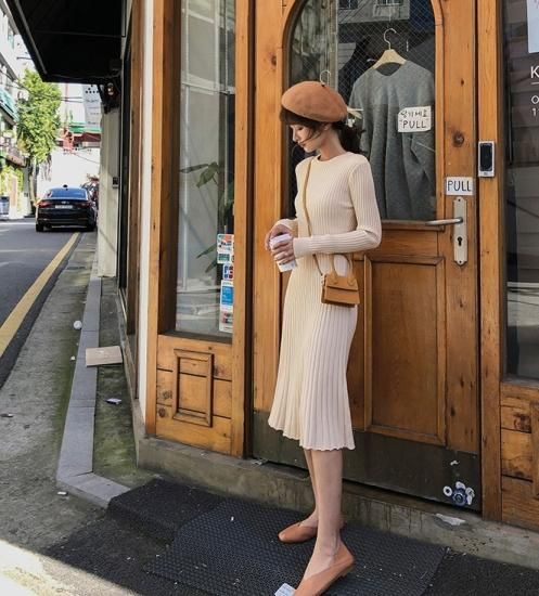 らくちんカワイイ◇長袖リブニット フレアワンピース 3色