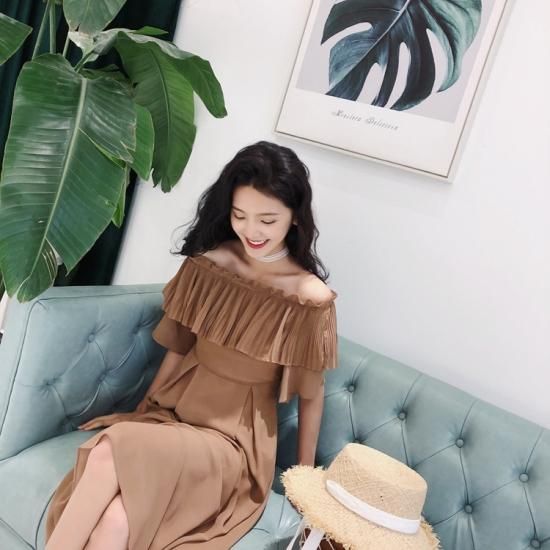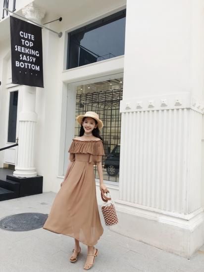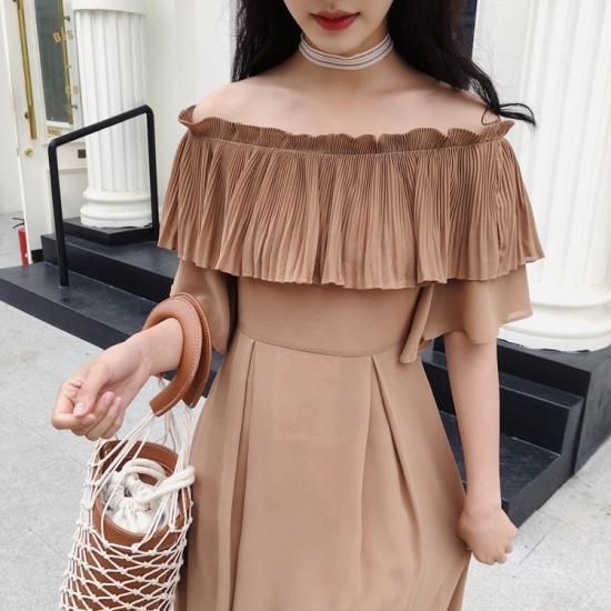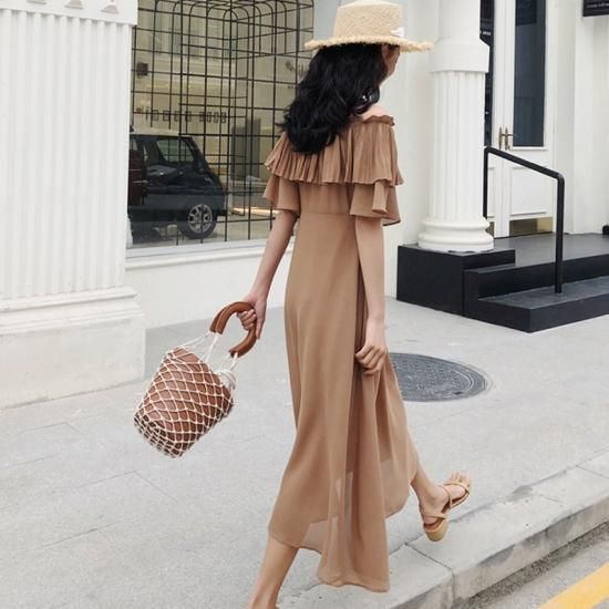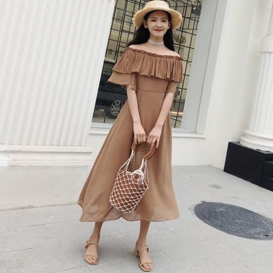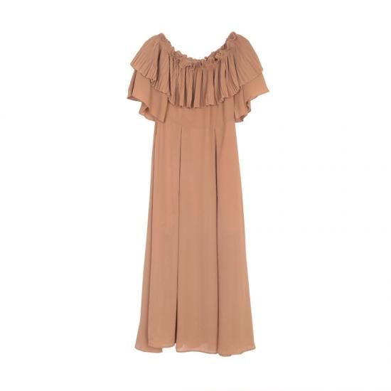 ヌーディーカラーが大人かわいい♪フリルオフショル ロングワンピース