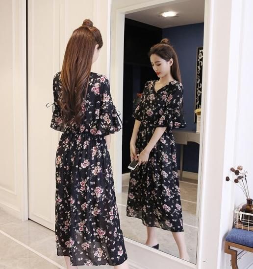 上品かわいいフラワープリント◇シフォン フレアワンピース 4色