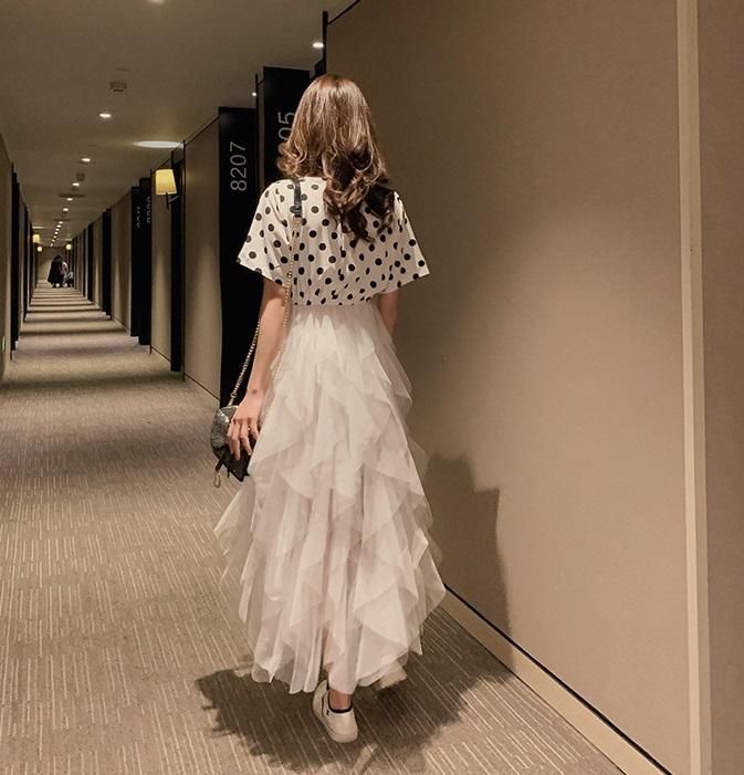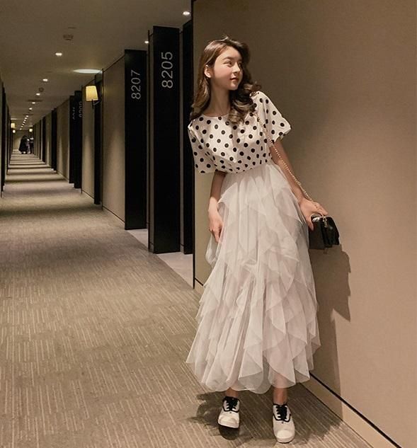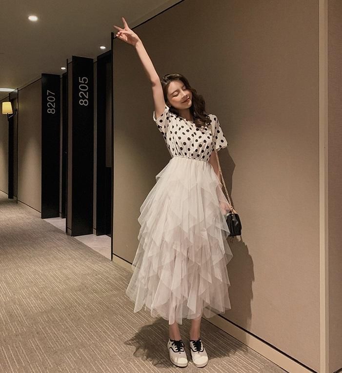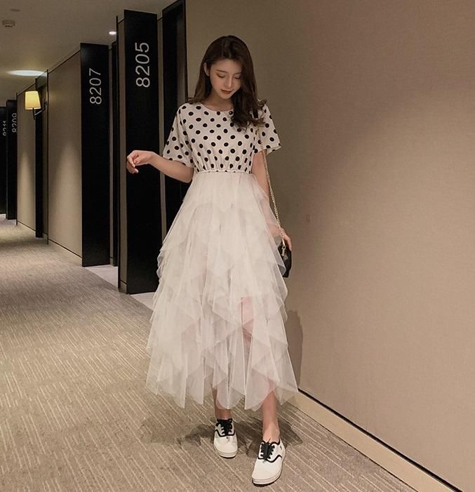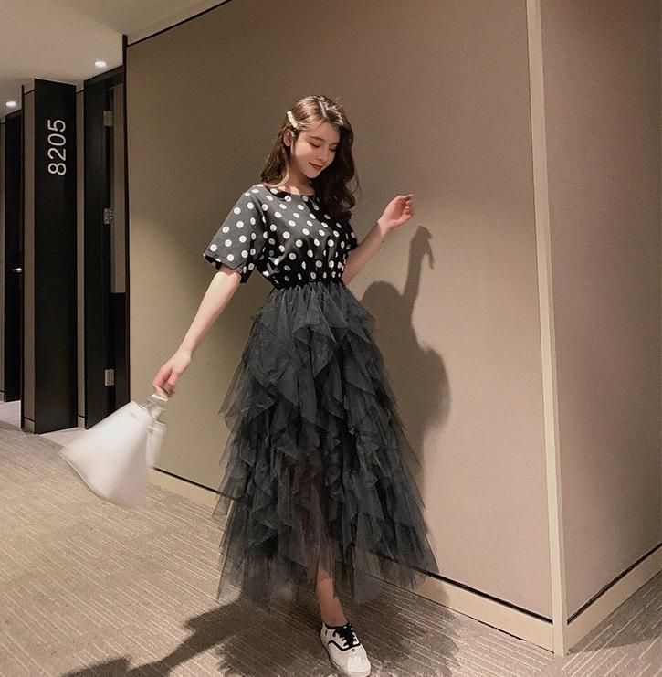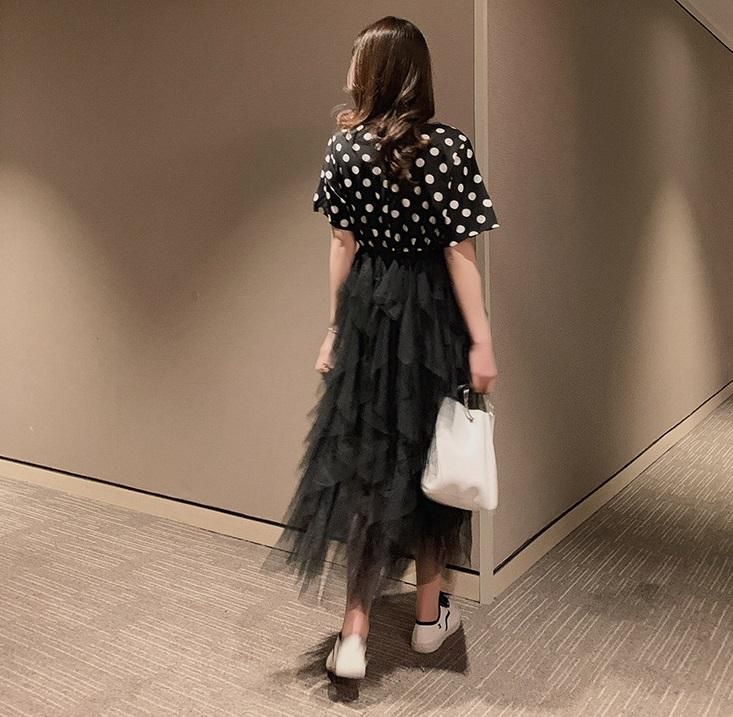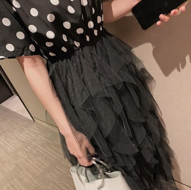 大人ガーリーなドット&チュール◇異素材ミックス 切り替えロングワンピース 2色