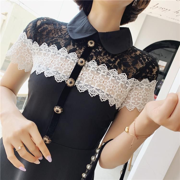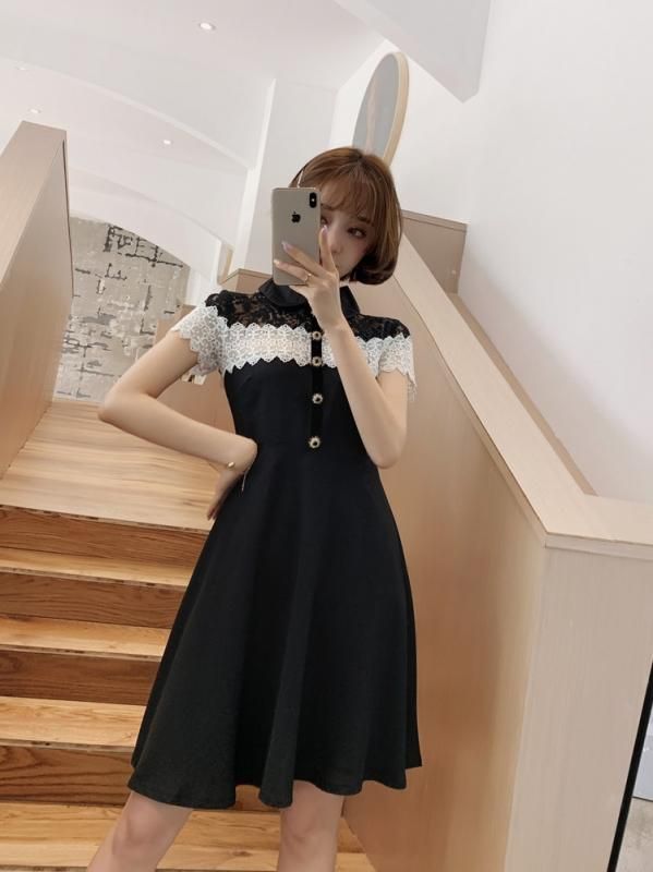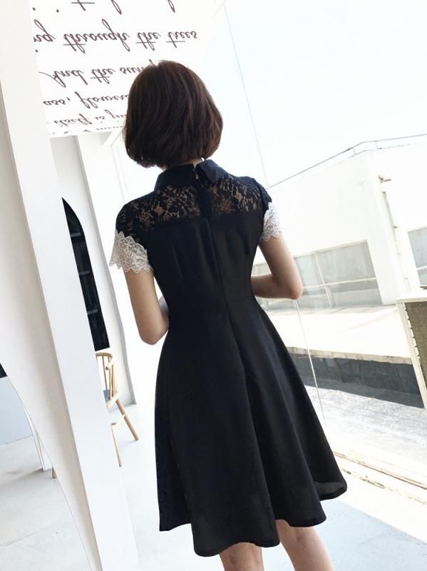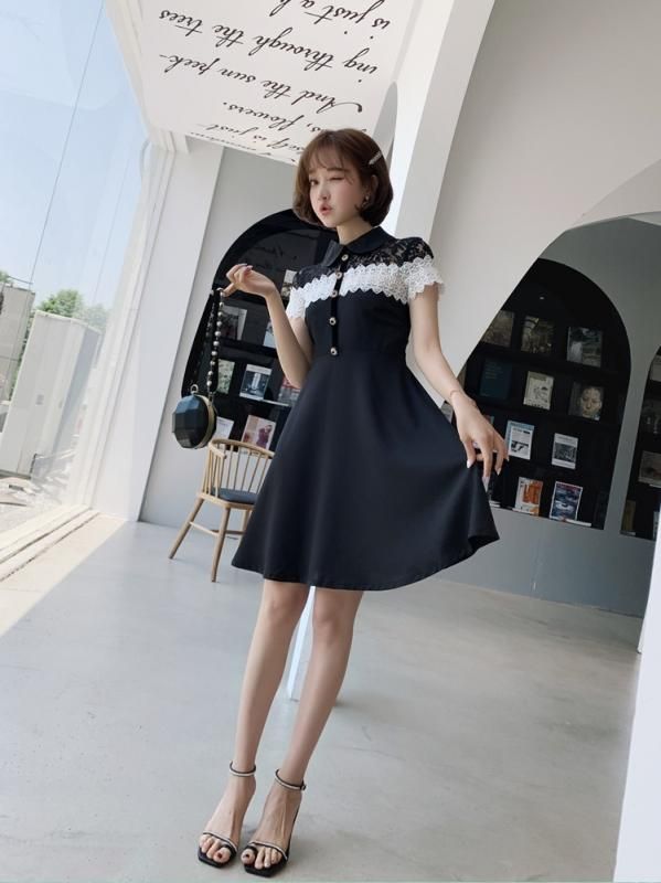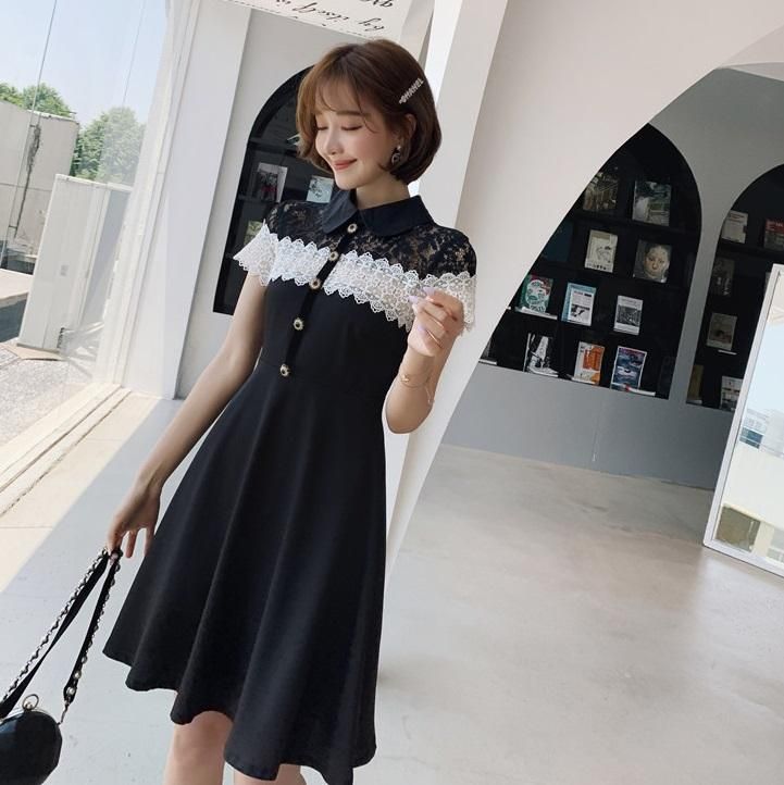 上品かわいいモノトーン♪レースデザインがキュートな襟付きフレアワンピース