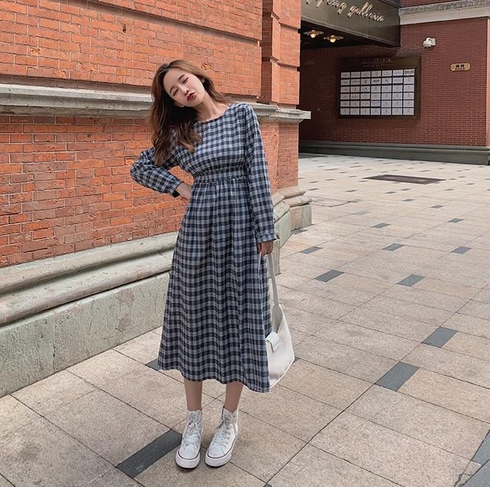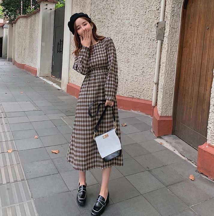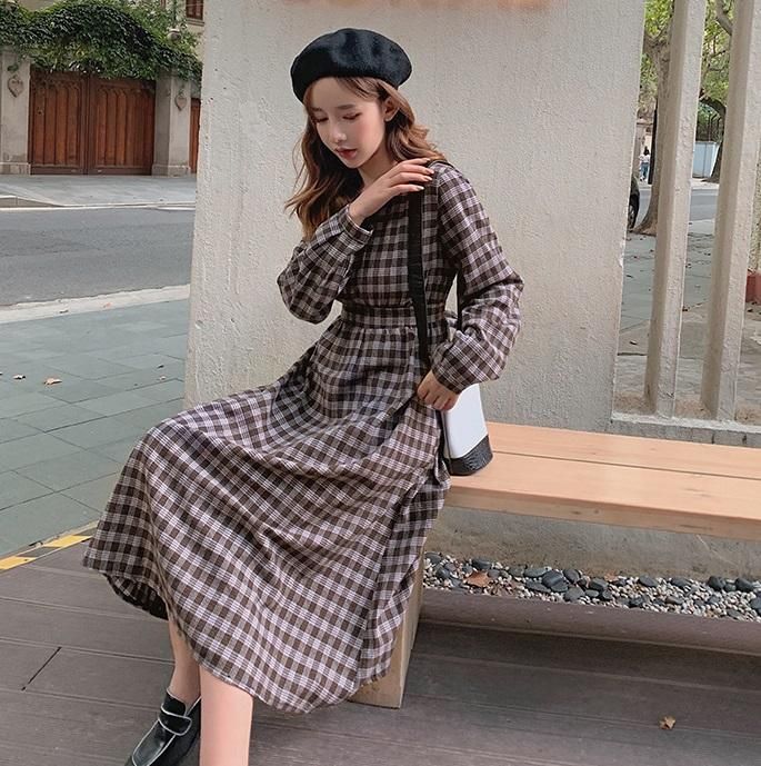ナチュラルで大人かわいい◇チェック柄 長袖ロングワンピース 2色