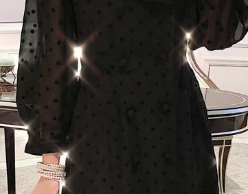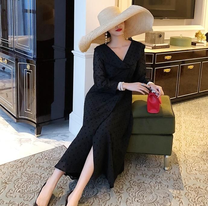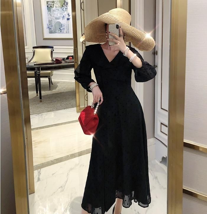 フェミニンなドットシフォン♪長袖 ロングフレアワンピース ドレス