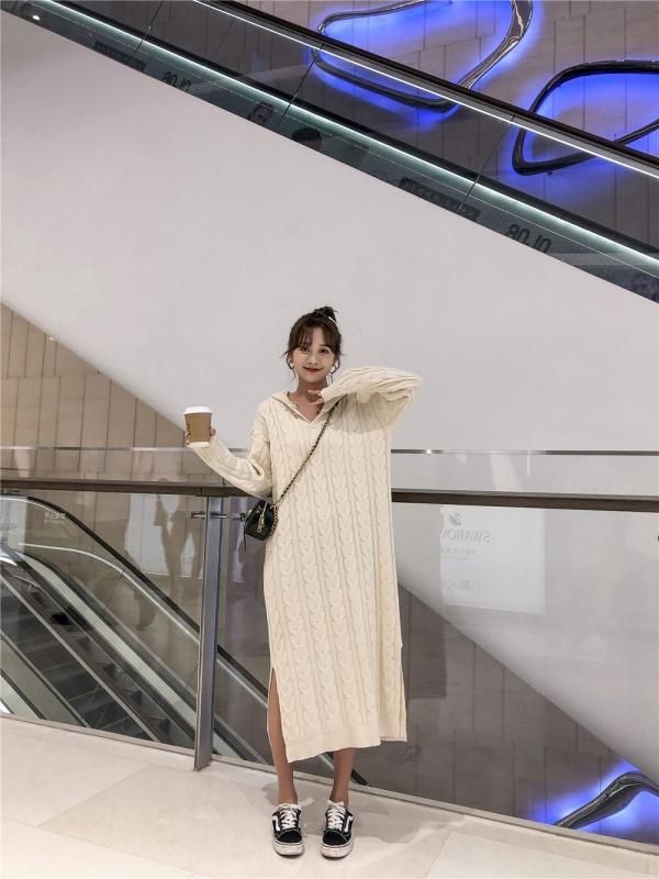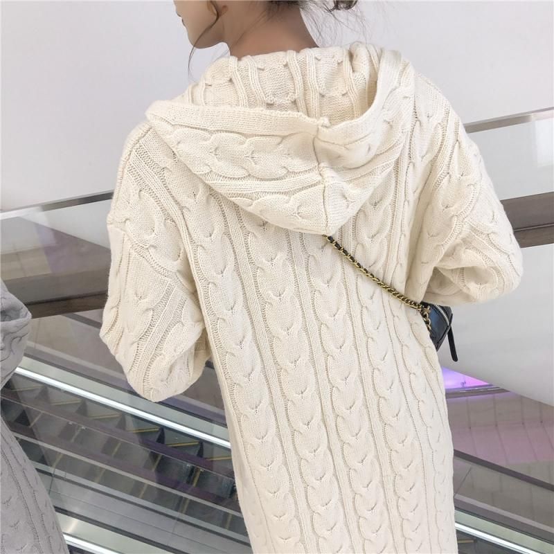 ゆるシルエットがかわいいケーブルニット◇ロングフーディーワンピース 2色