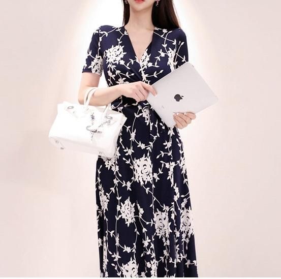 大人なモノトーンのフラワープリント◇カシュクール風 ロングワンピース