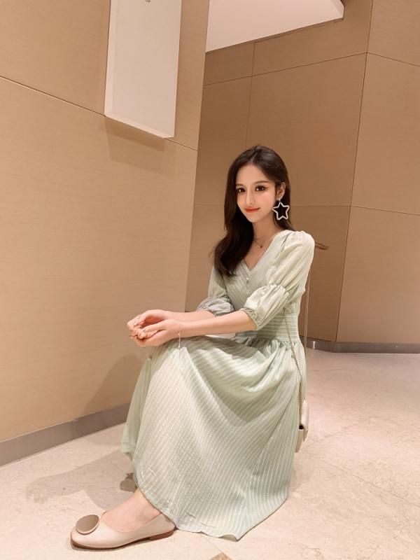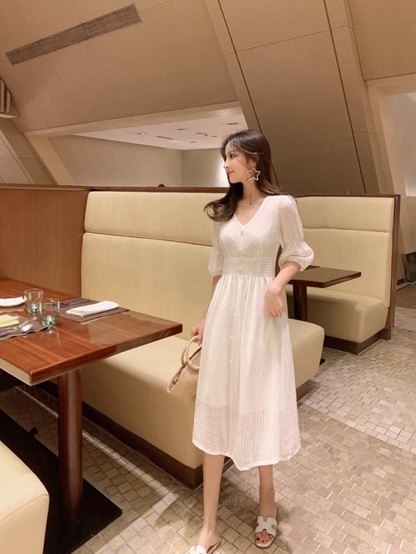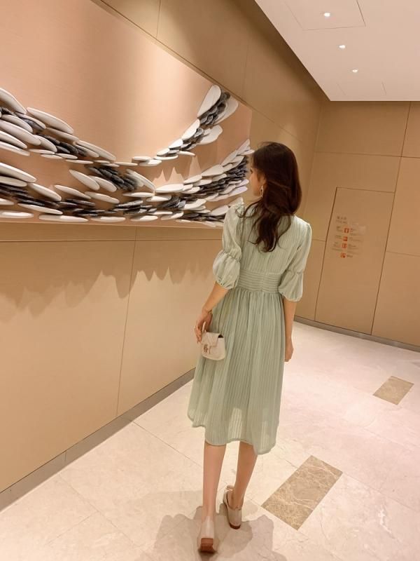 大人ガーリーなふんわりワンピ◇パフスリーブ ミディ丈ワンピース 2色