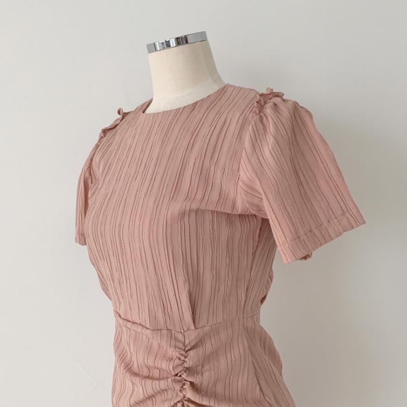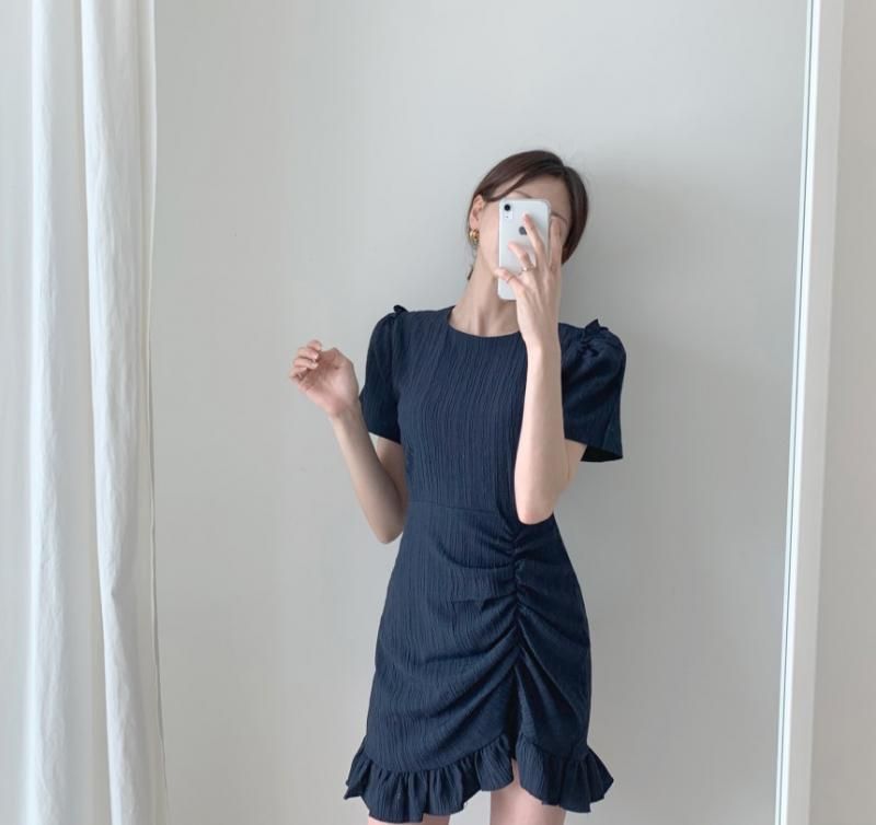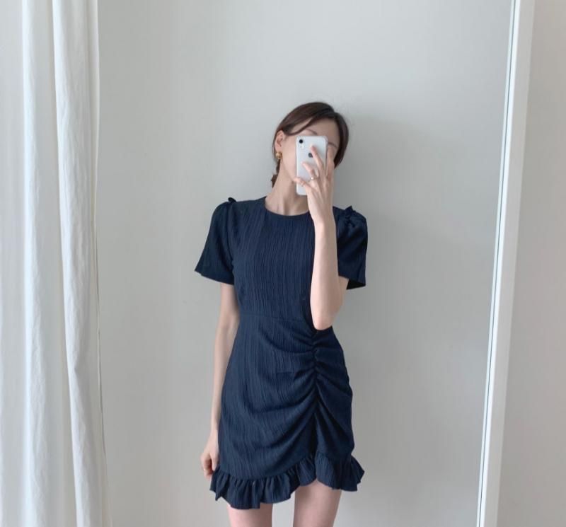 シャーリング&フリルがかわいい♪半袖 ミニワンピース 2色