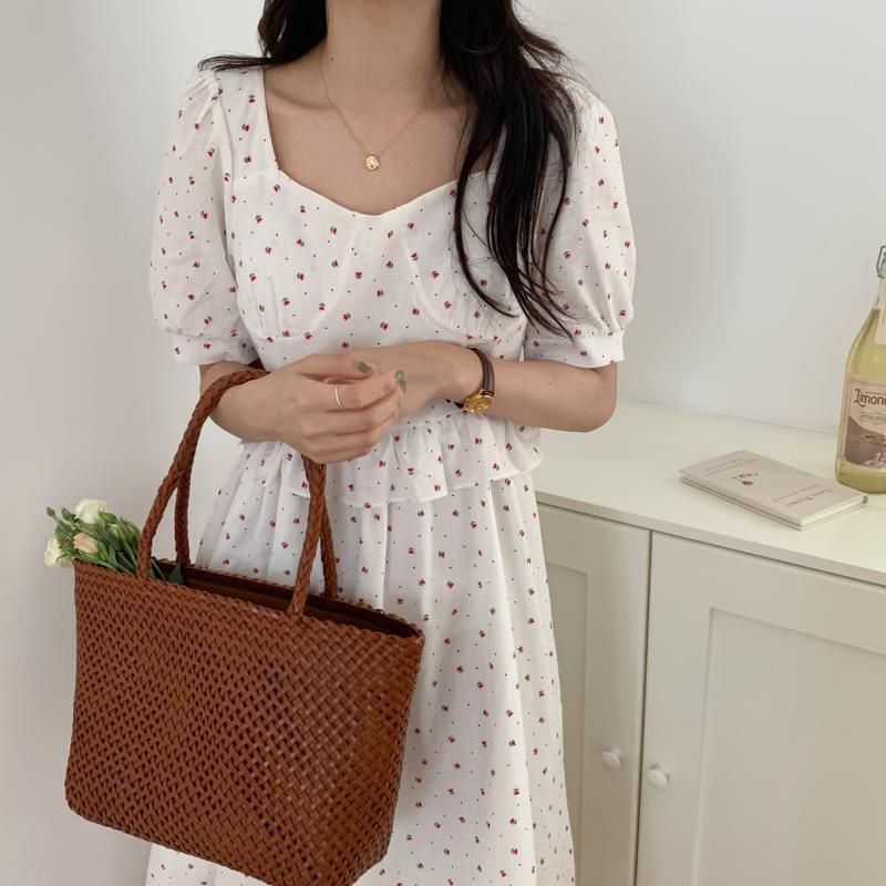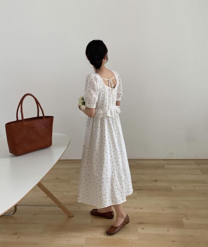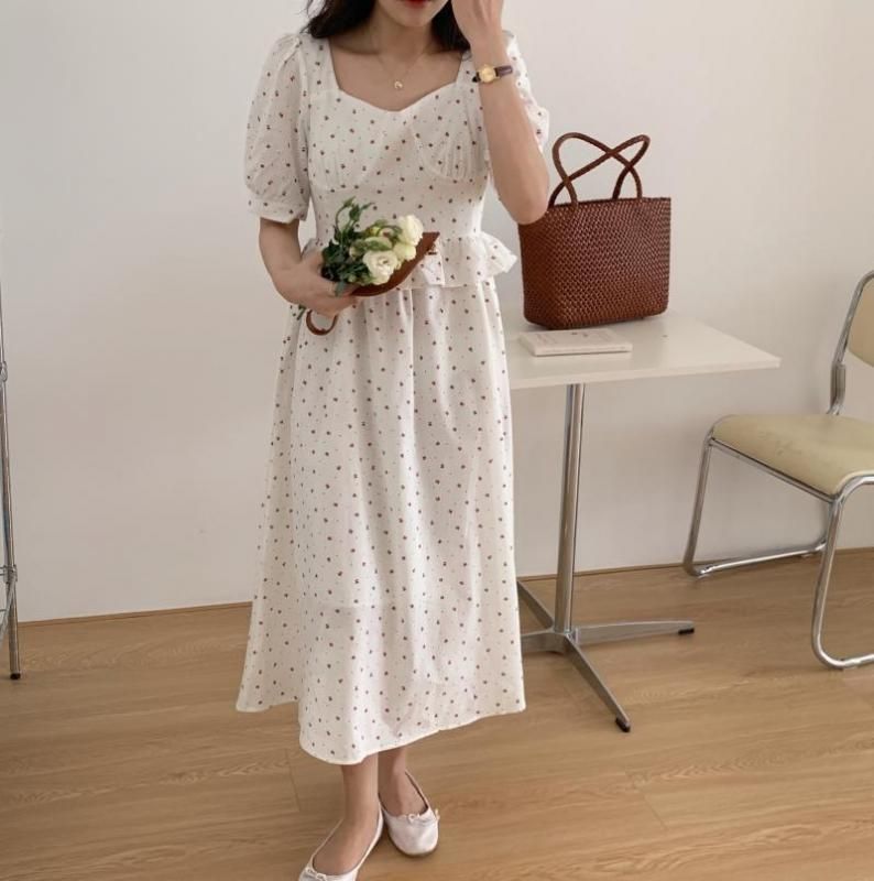ぺプラム切り替えがかわいい♪小花柄 パフ袖 ロングフレアワンピース