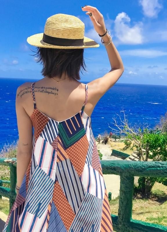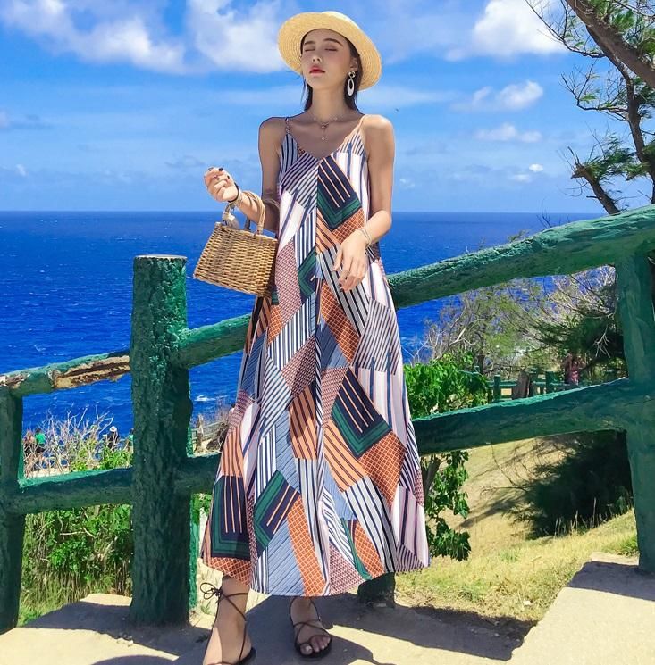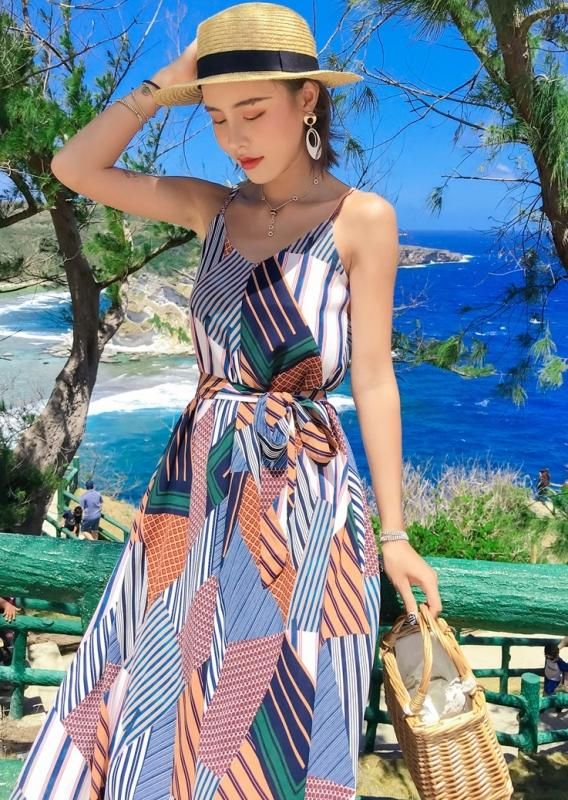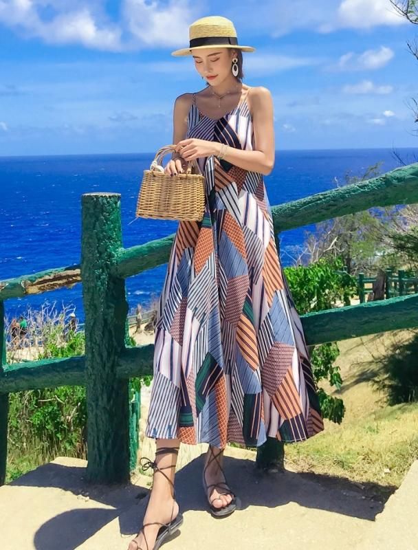 リゾートにぴったりな総柄デザイン◇ウエストリボン マキシキャミワンピース
