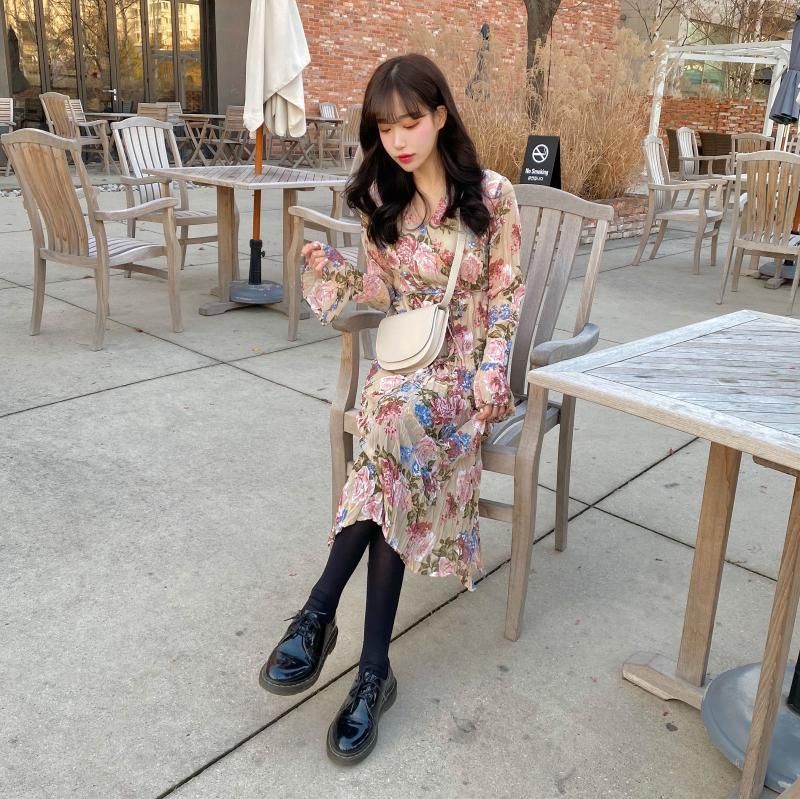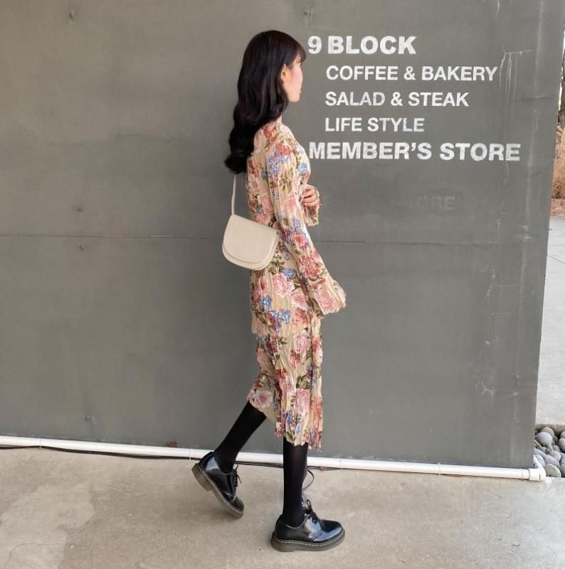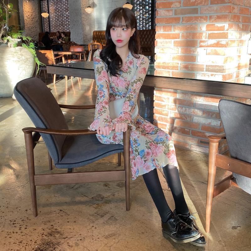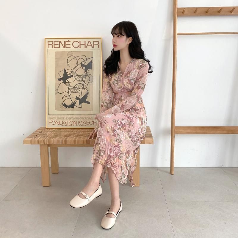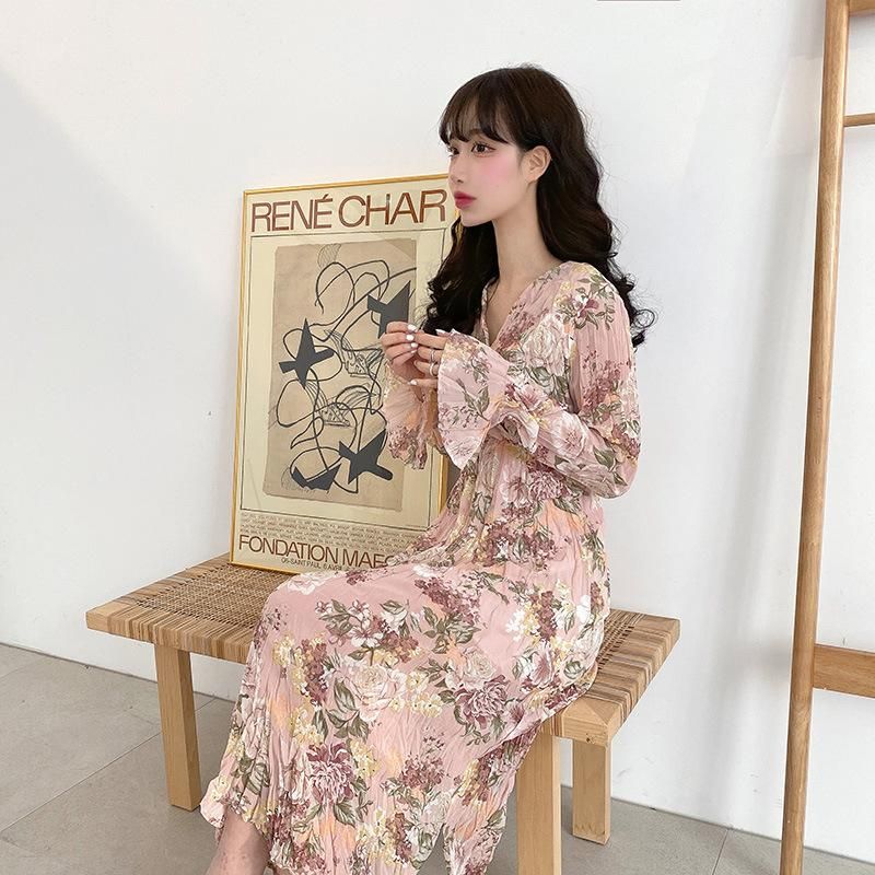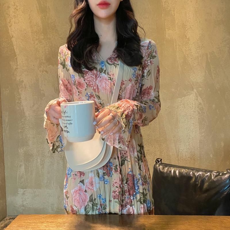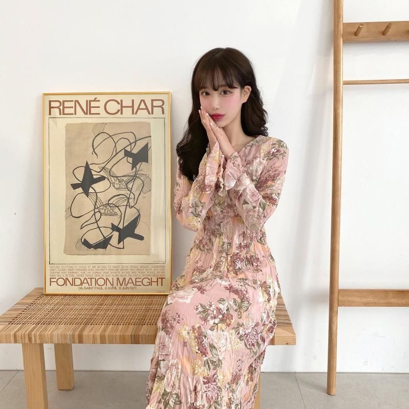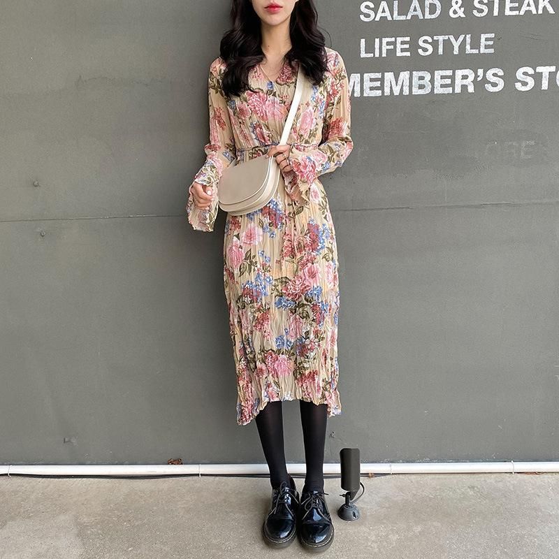 大人かわいいフラワープリントワンピ♪シワ加工 長袖 フレアワンピース 2色