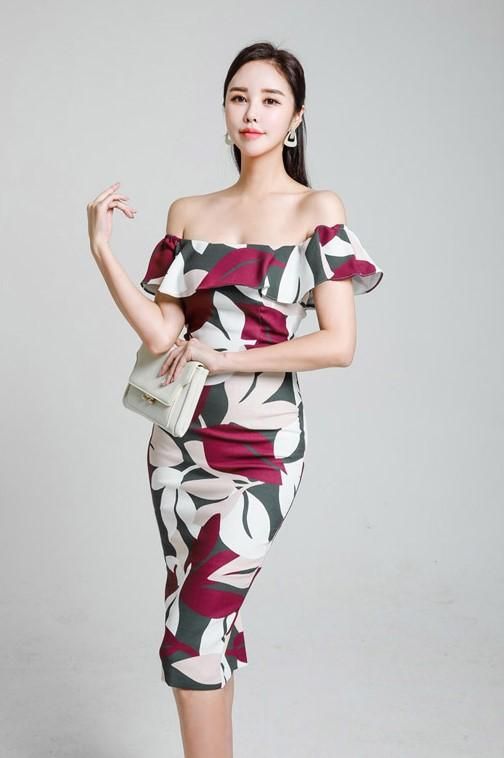 エレガントなボタニカルプリント フリルオフショルの膝丈タイトワンピース