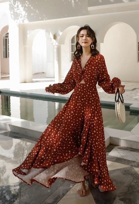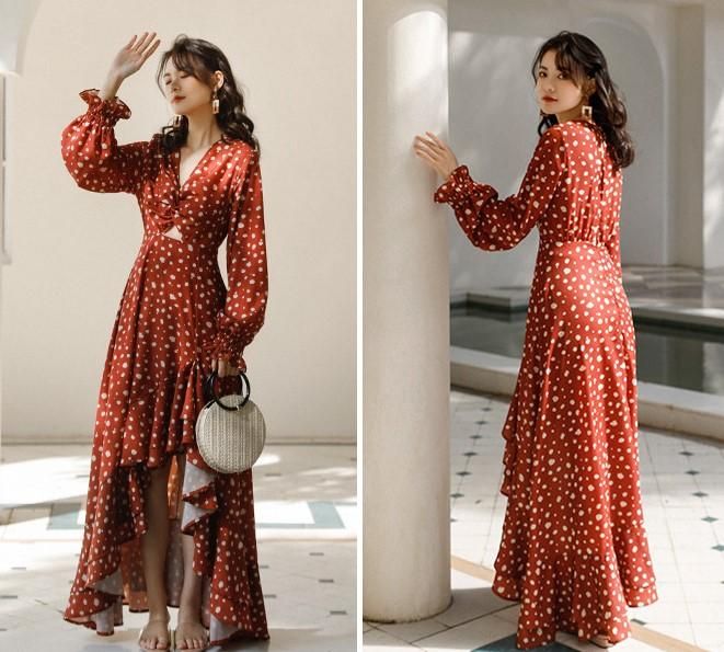 レトロかわいいドット柄 お腹チラ見せツイストのフィッシュテールマキシワンピース