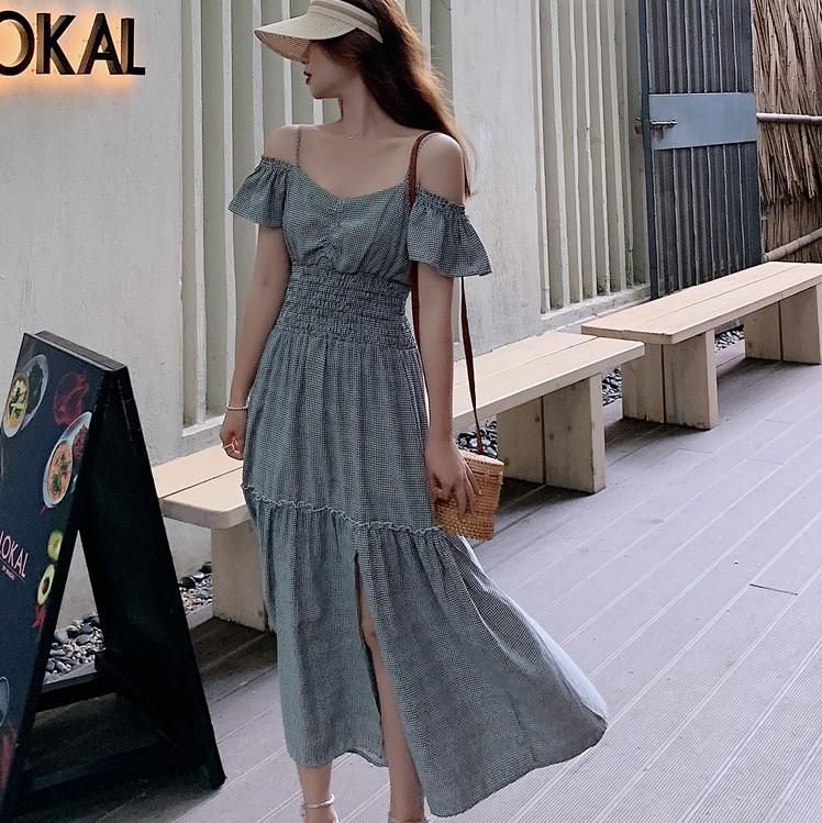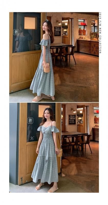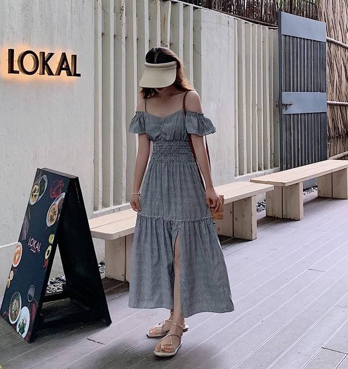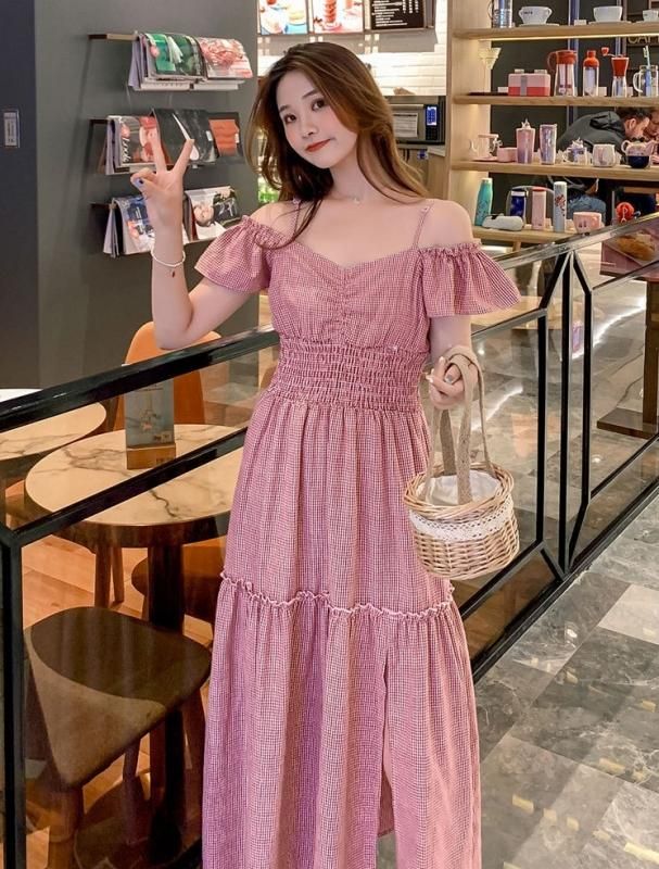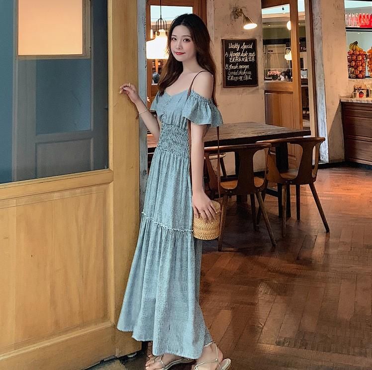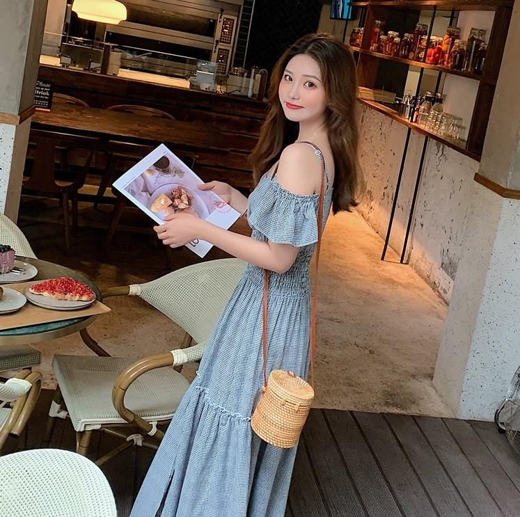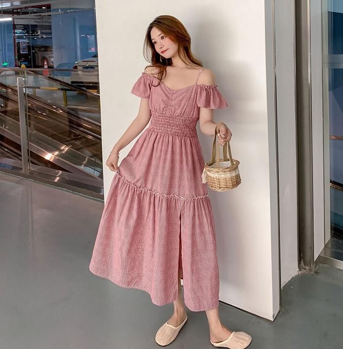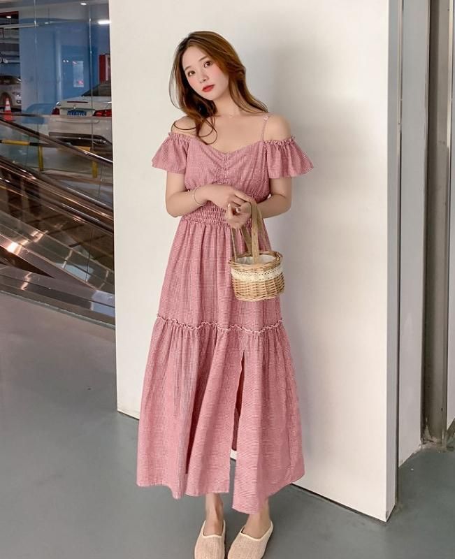 大人ガーリーな人気デザイン ギンガムチェックがかわいいフリルオフショルワンピース 2色