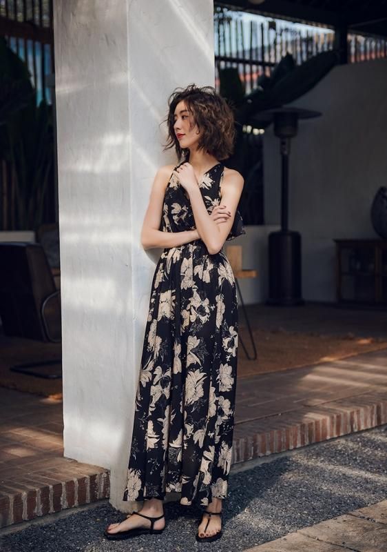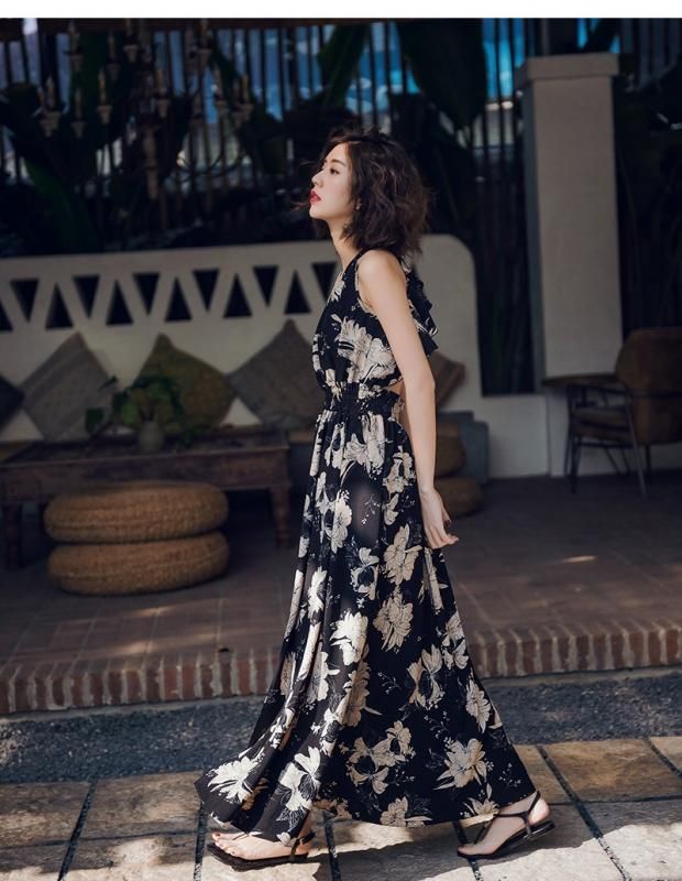 エレガントなボタニカル柄 フリルがかわいいバックコンシャスのノースリーブマキシワンピース