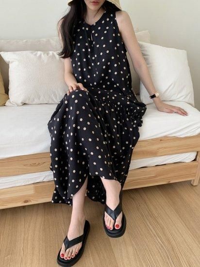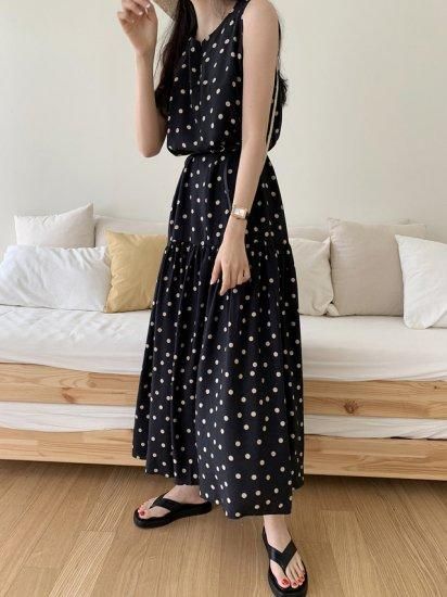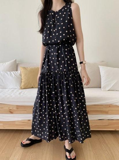 レトロかわいいドット柄 ふんわりギャザーのマキシ丈ノースリーブワンピース 2色