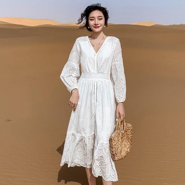 人気の海外デザイン 大人かわいい透かしレースの袖ありロングワンピース 2パターン