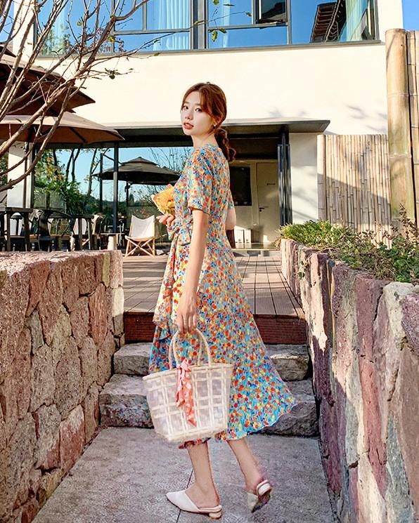 鮮やかなマルチカラープリントがおしゃれ サイドリボンの半袖フレアロングワンピース