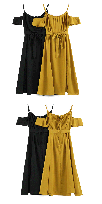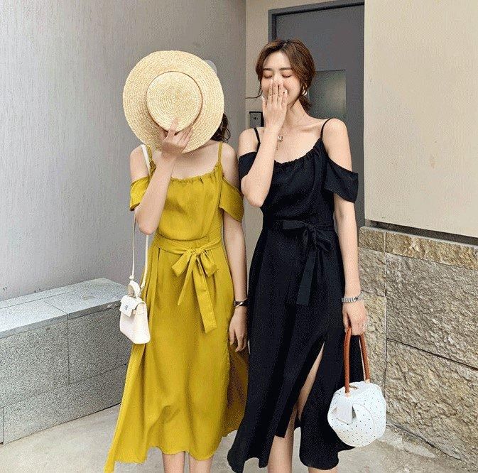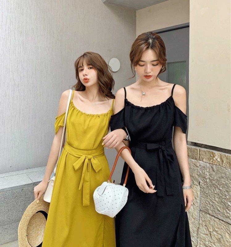 春夏やリゾートコーデにおすすめ オープンショルダーのリボン付きロングフレアワンピース 2色