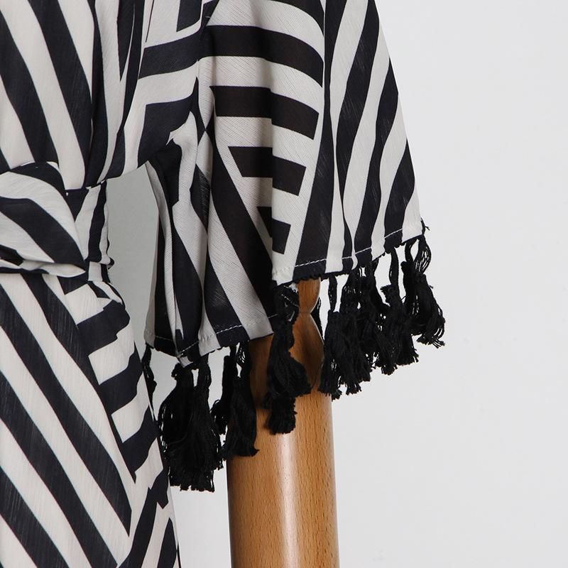 個性的でおしゃれな海外デザイン モダンなバイカラーのフリンジ付きマキシワンピース