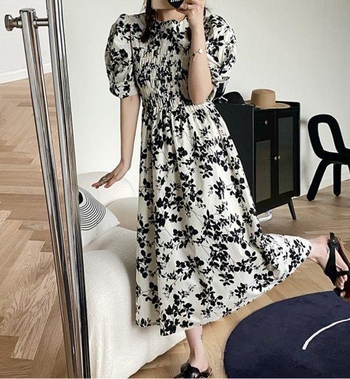 おしゃれに体型カバー ゆったりかわいいモノトーンのボタニカル柄パフ袖ロングワンピース
