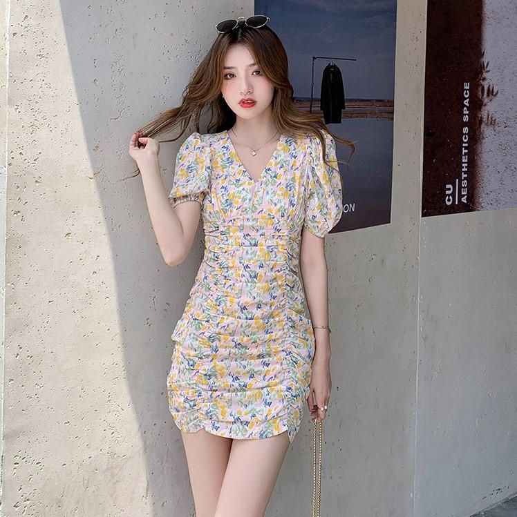 鮮やかなカラフルプリント たっぷりギャザーのミニ丈半袖タイトワンピース 2色