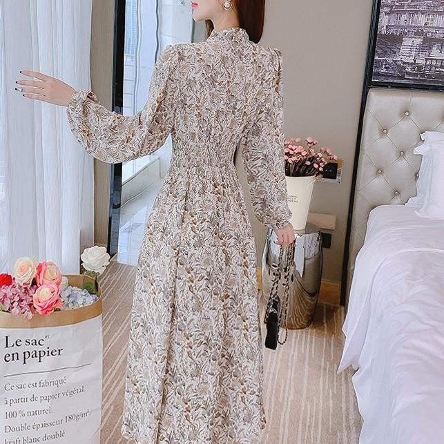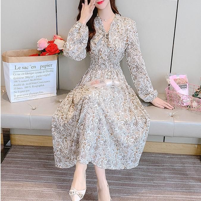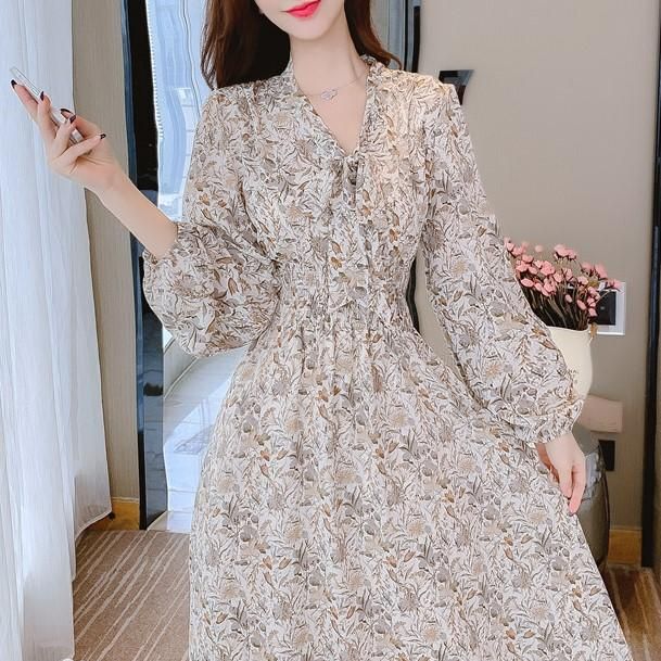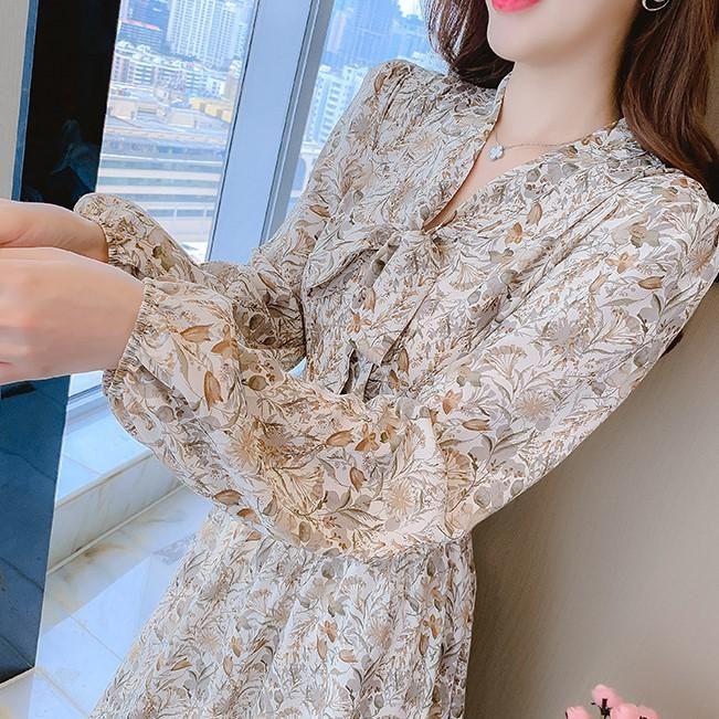レトロかわいいボタニカルプリント 大人ガーリーなリボン付きロング丈長袖フレアワンピース