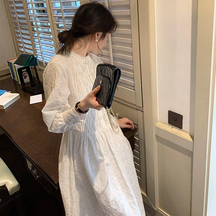 オールシーズン活躍 清楚かわいいフレアシルエットのロング丈長袖刺繍白ワンピース