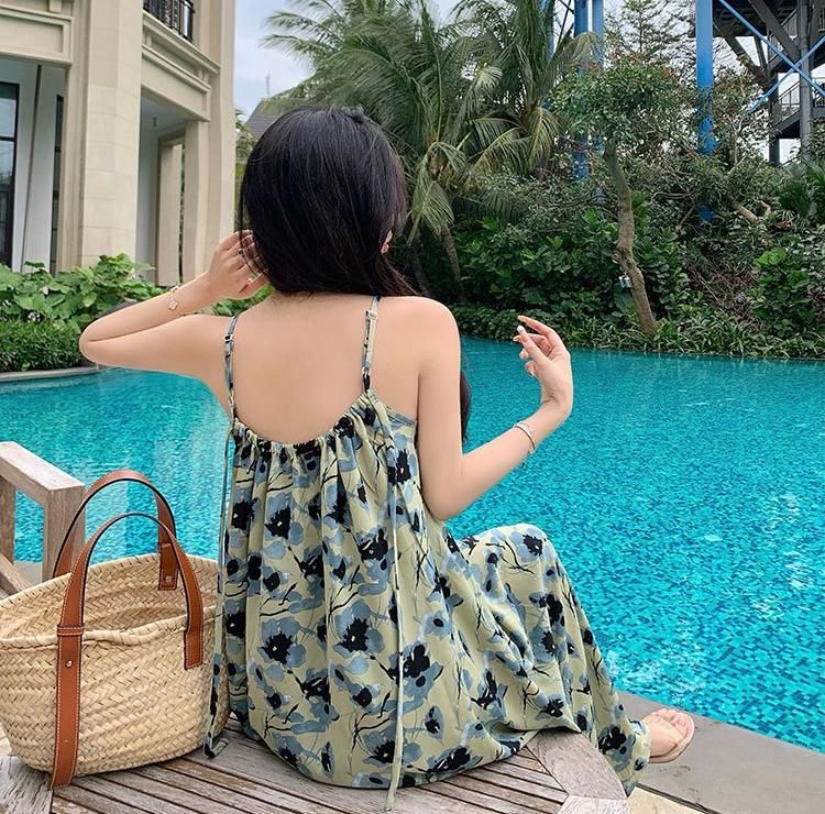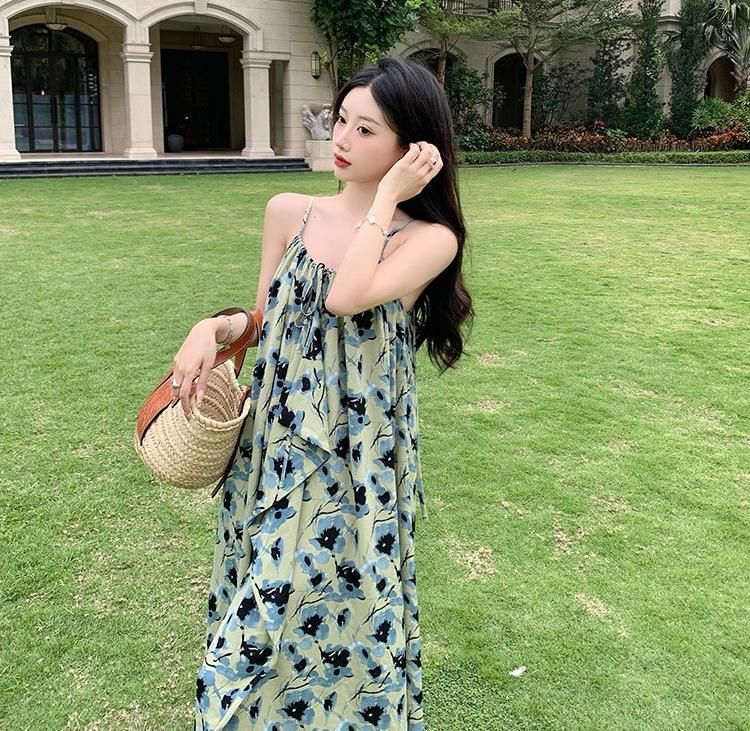 体型カバー力抜群 華やかなフラワープリントのロング丈キャミソールギャザーワンピース