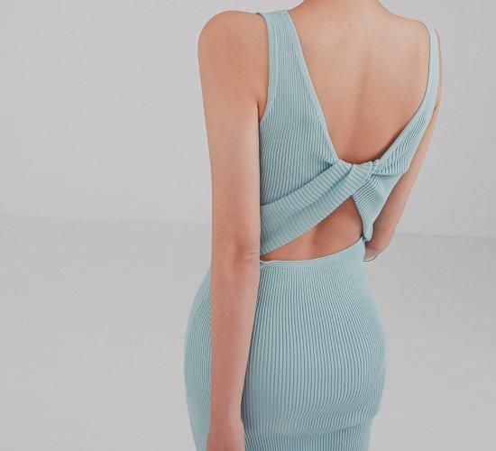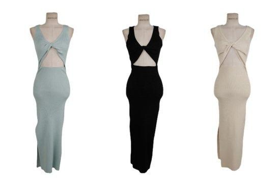 大胆セクシーなバックコンシャス 細リブのロング丈ノースリーブボディコンワンピース 3色