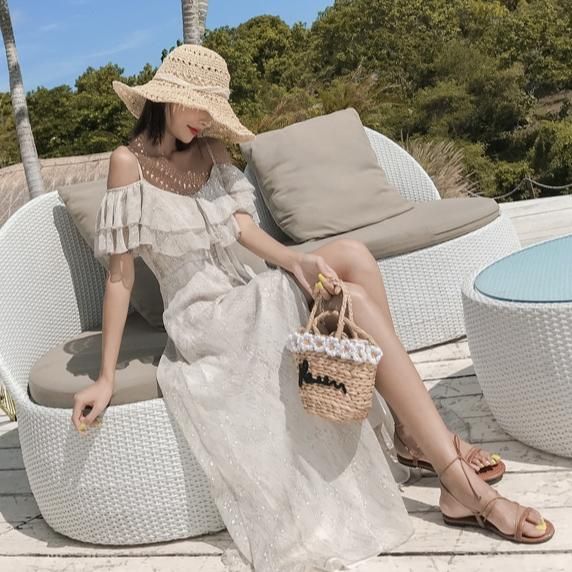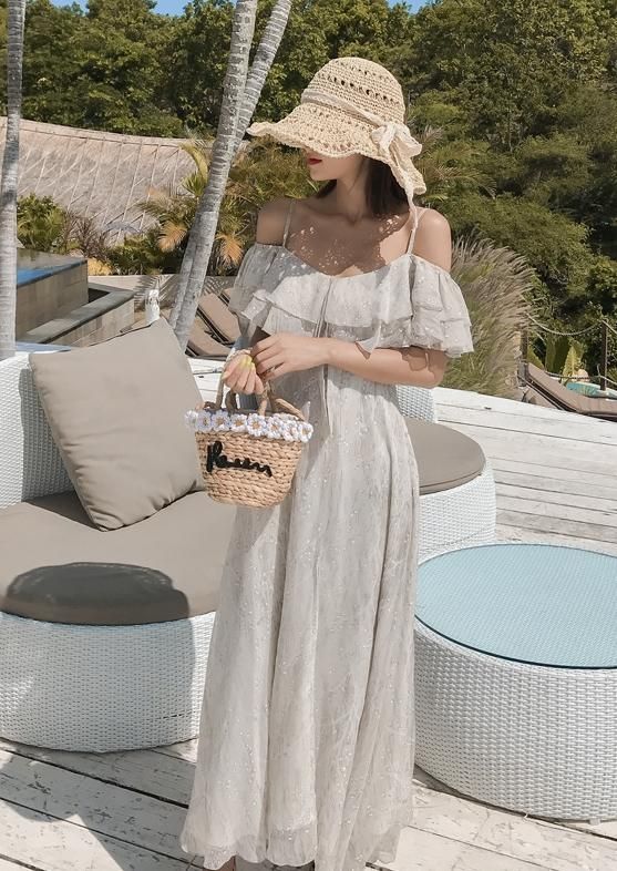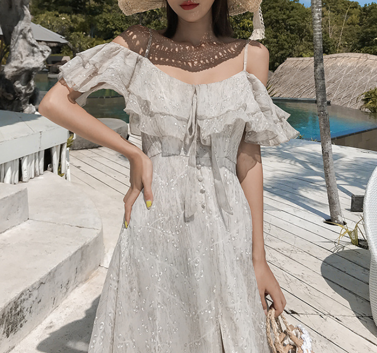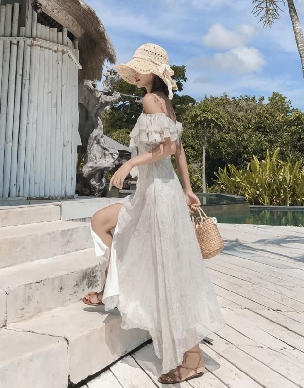 リゾートウエディングやお呼ばれにも ティアードフリルのオフショルがかわいいロング丈スリットワンピース ドレス