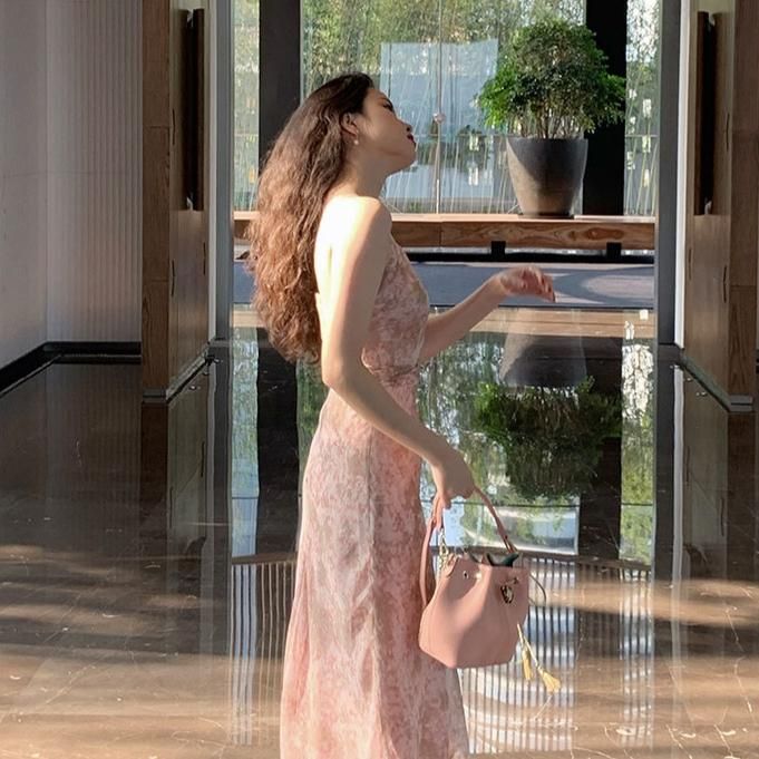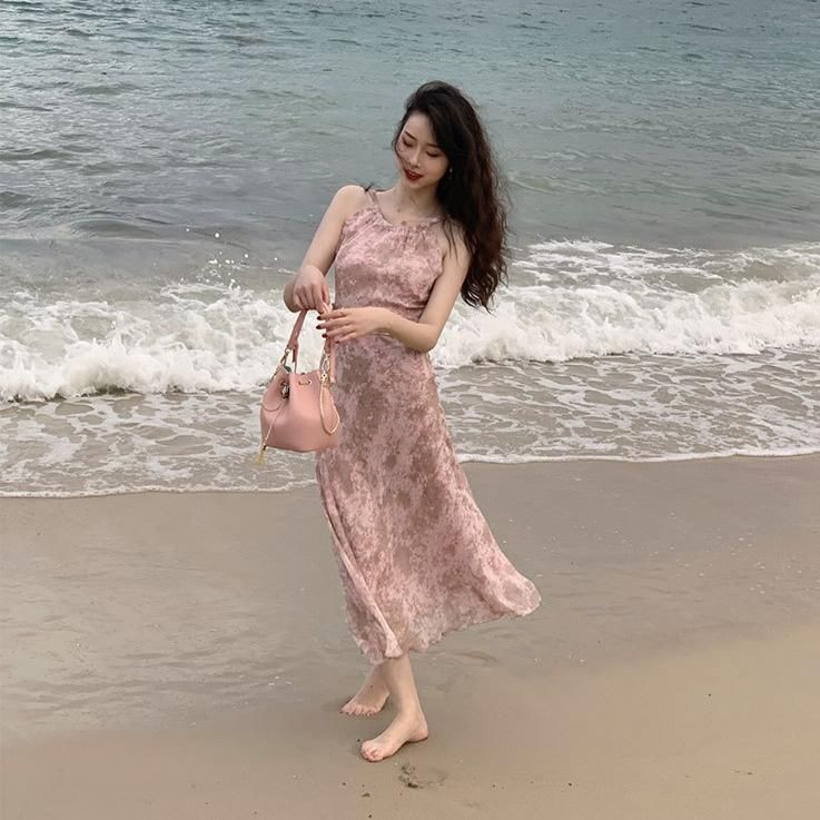M〜3Lの大きいサイズも展開 ホルターネックのロング丈リゾートシフォンワンピース カジュアルドレス