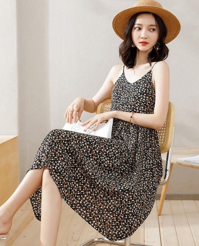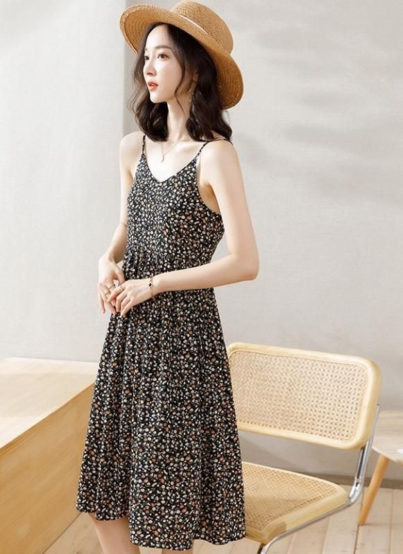 カジュアルかわいい小花柄プリントの膝丈キャミソールフレアワンピース 2色