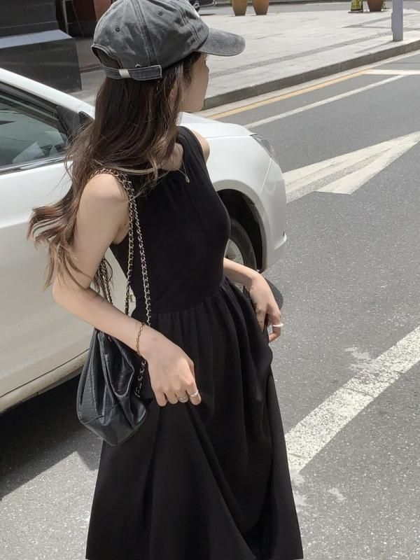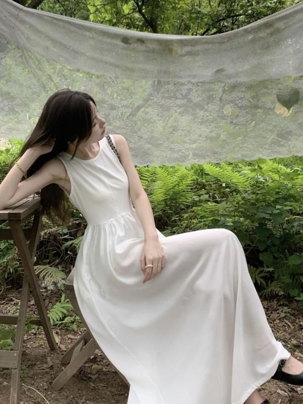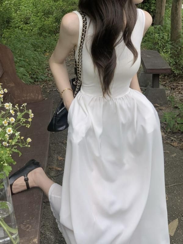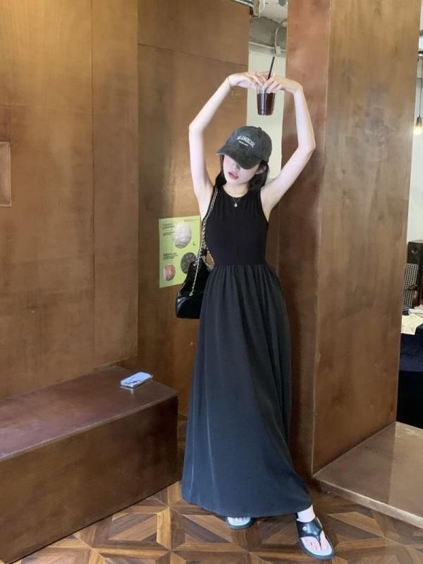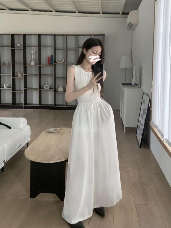 夏旅行やリゾートコーデに人気 大人カジュアルなマキシ丈ノースリーブのギャザーワンピース 2色