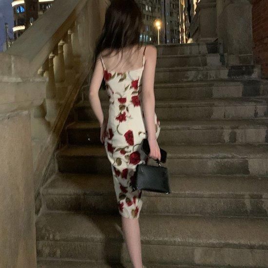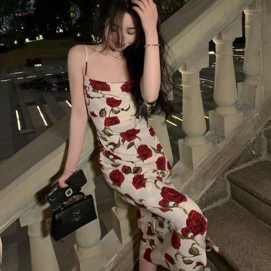 エレガントなローズプリント ロング丈キャミソールのタイトワンピース リゾートドレス
