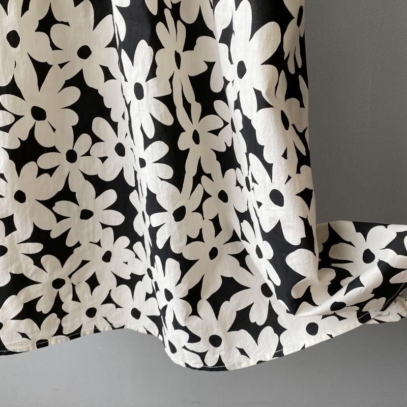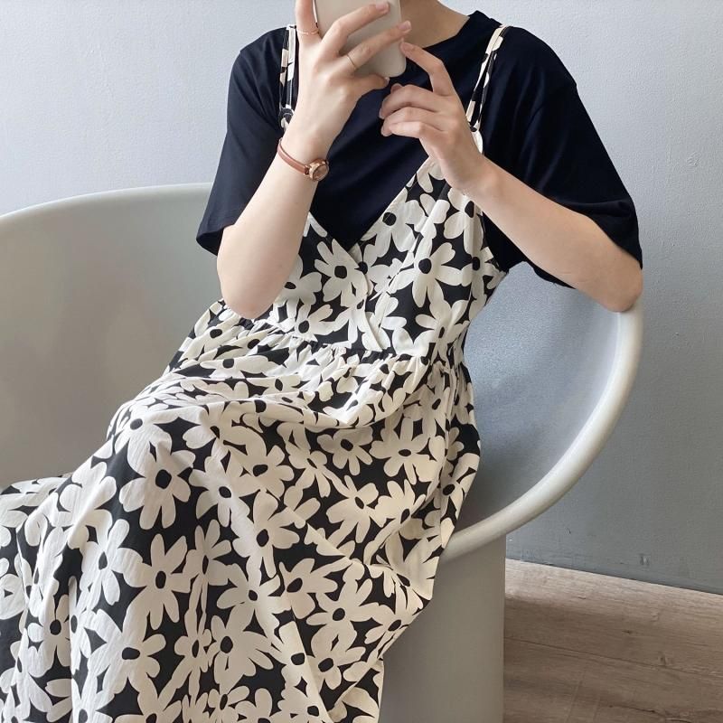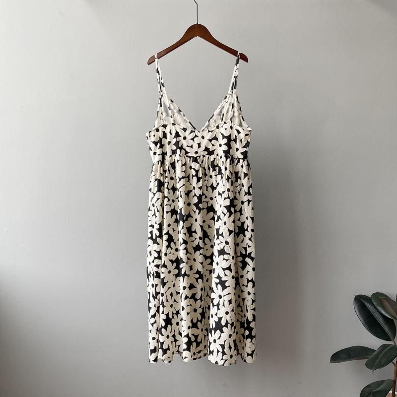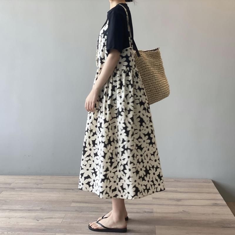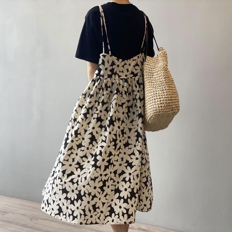 ゆったりシルエットで体型カバー モノトーン花柄プリントのロング丈キャミソールワンピース