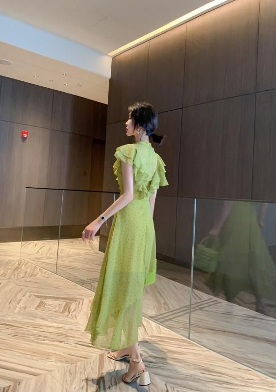 オトナかわいいボリュームフリル プチドット柄ロング丈シアードレス ワンピース