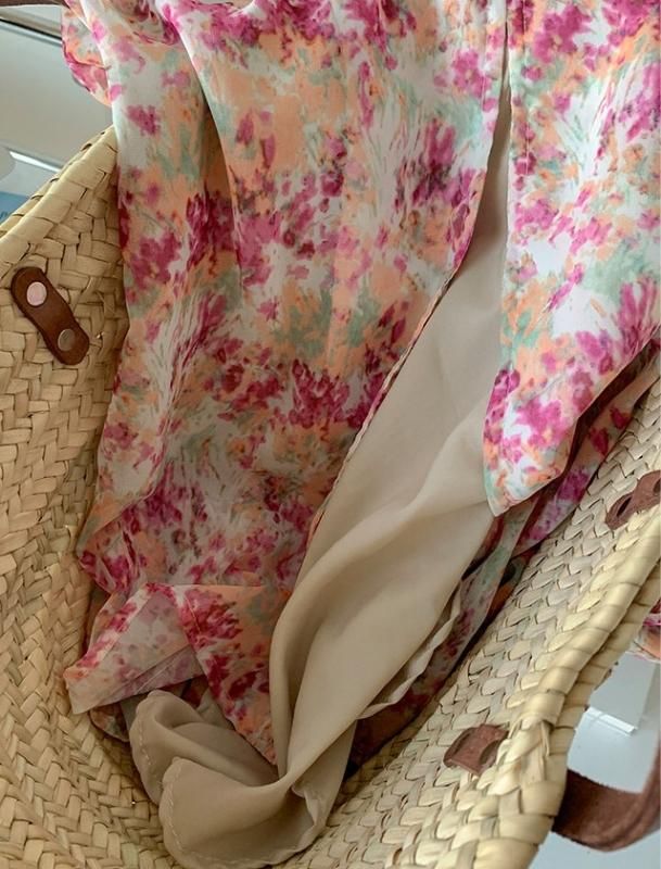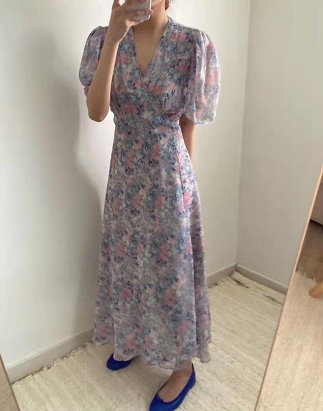 マルチカラーの華やぎプリント ボリュームスリーブがおしゃれなロング丈Vネックワンピース 3色