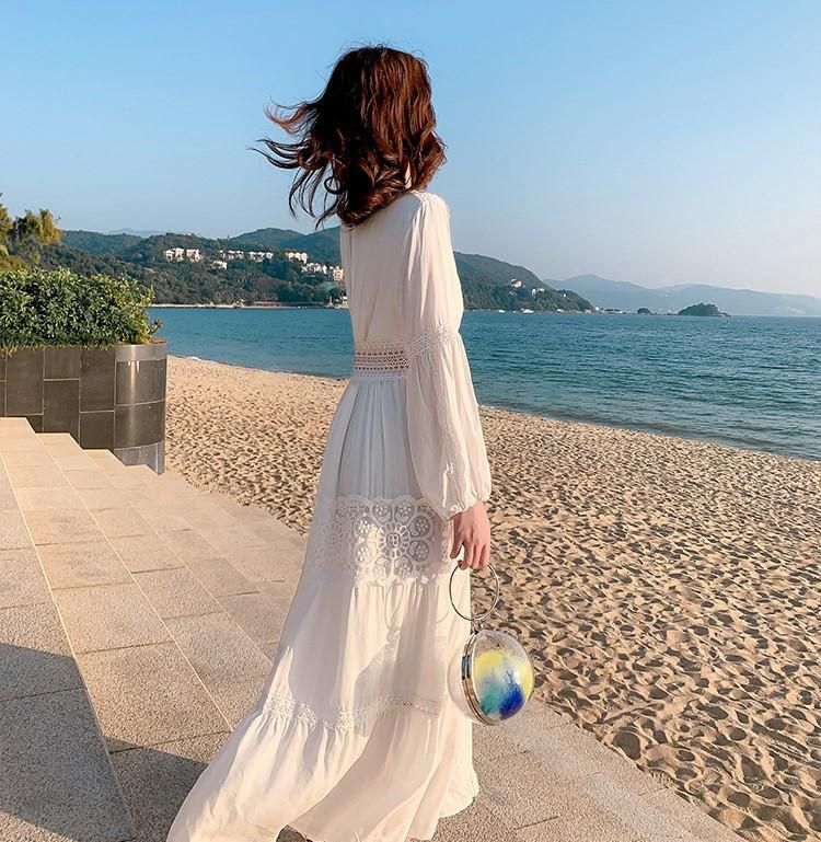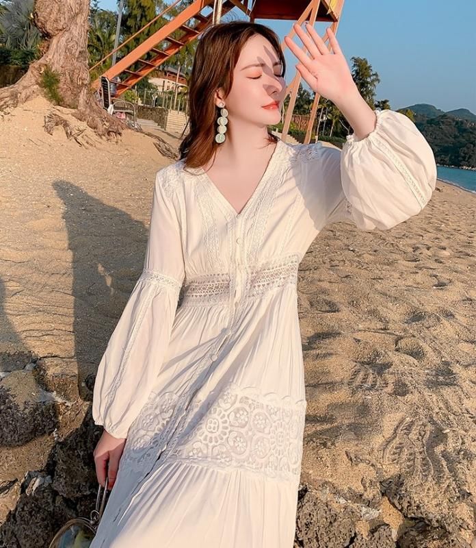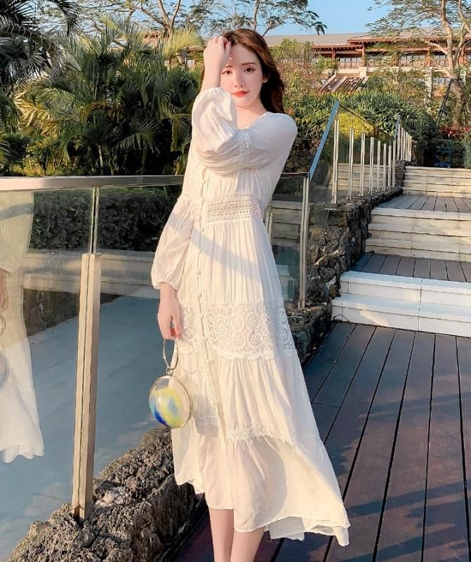 透かしレースのティアードスカート ロング丈長袖シャーリング白ワンピース