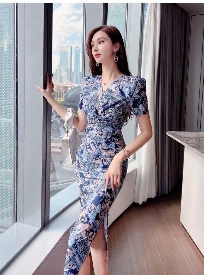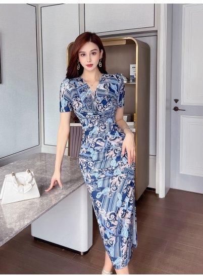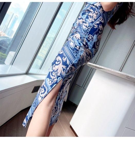 カラフルプリントがおしゃれ 大人フェミニンなミモレ丈半袖タイトワンピース リゾートドレス