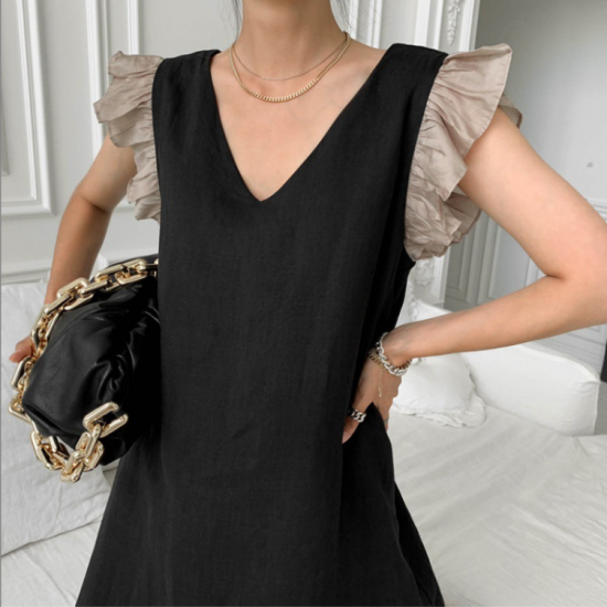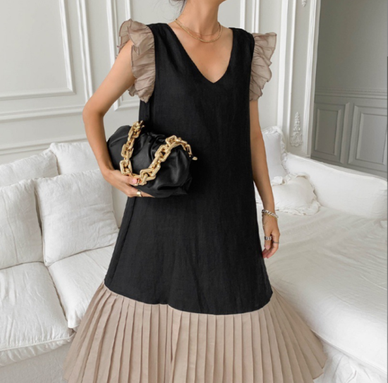 フリルやプリーツがおしゃれ オトナかわいいバイカラーのロング丈ワンピースVネックワンピース