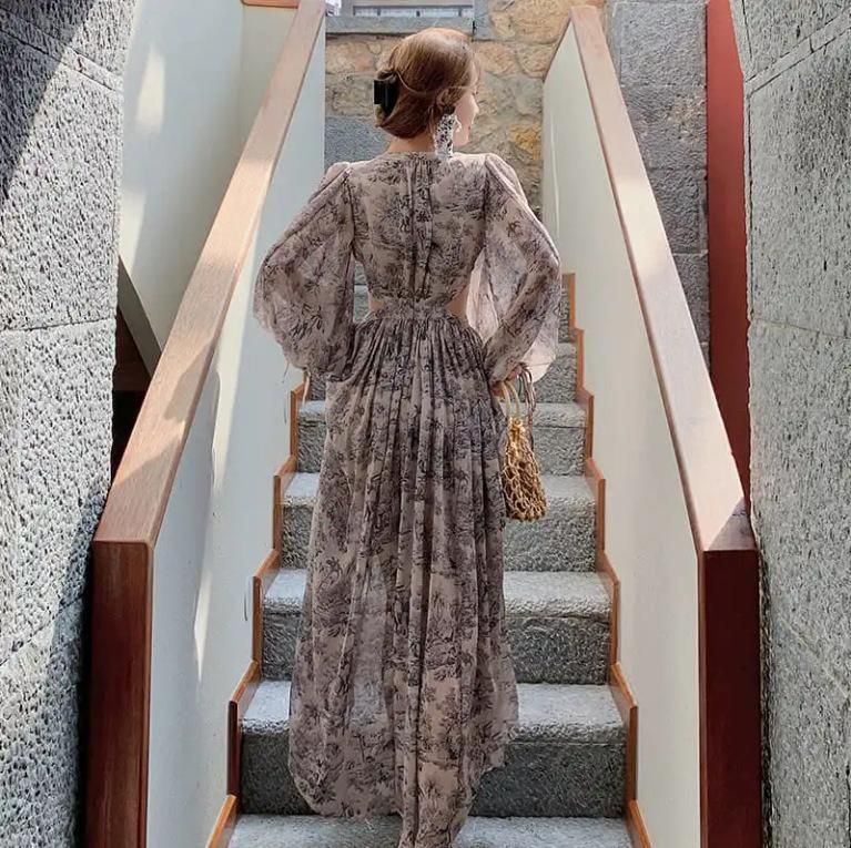 チラ見せカットでセクシーに マキシ丈総柄バルーンスリーブのスリットワンピース リゾートドレス