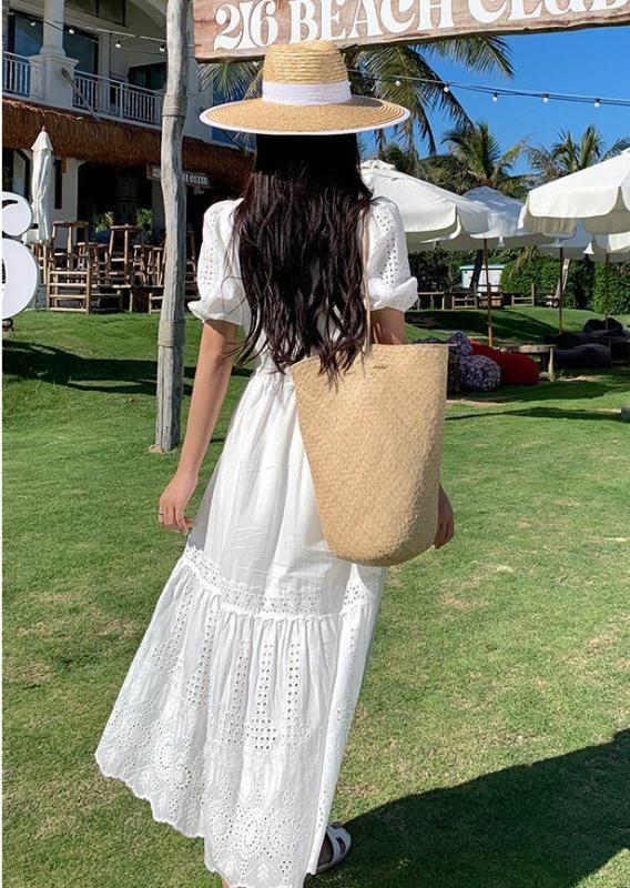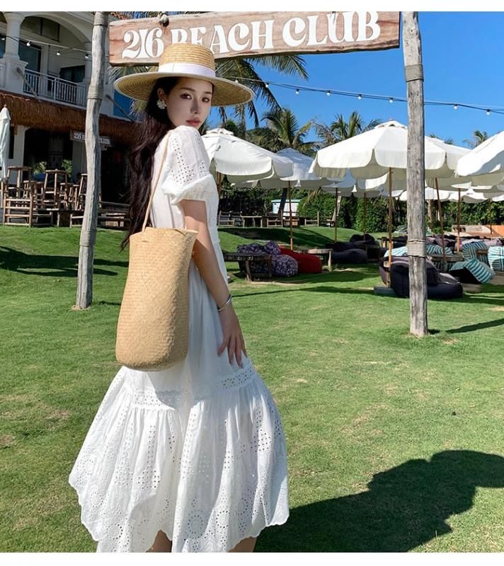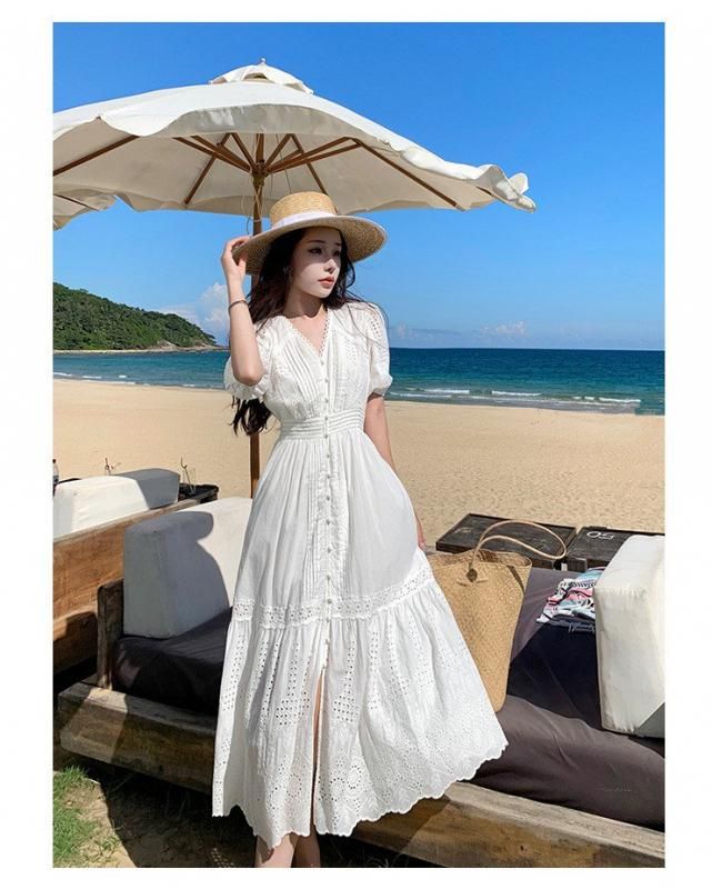 人気の春夏コーデ パフスリーブのロング丈透かしレース白ワンピース リゾートドレス