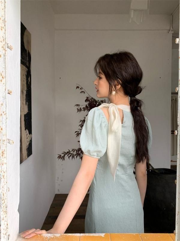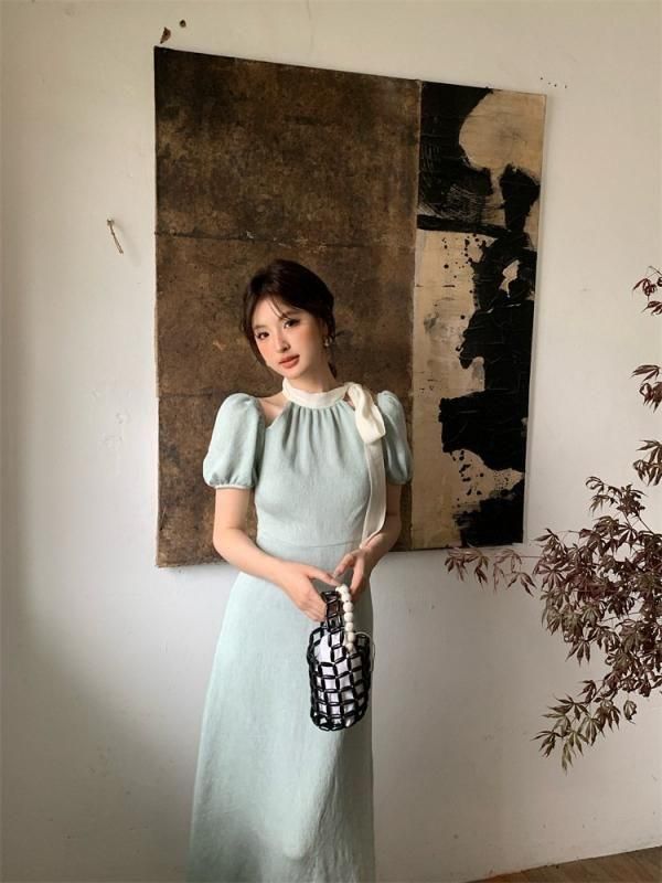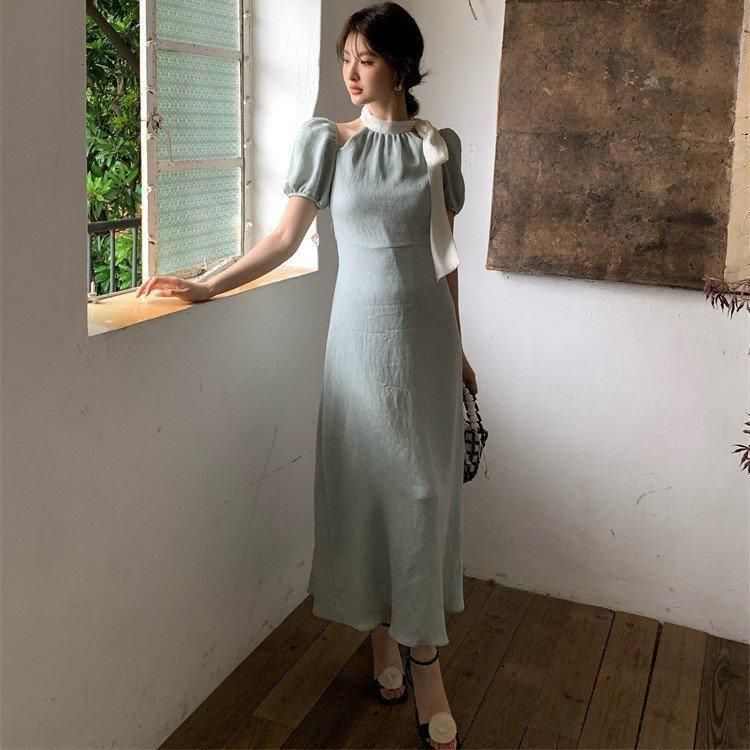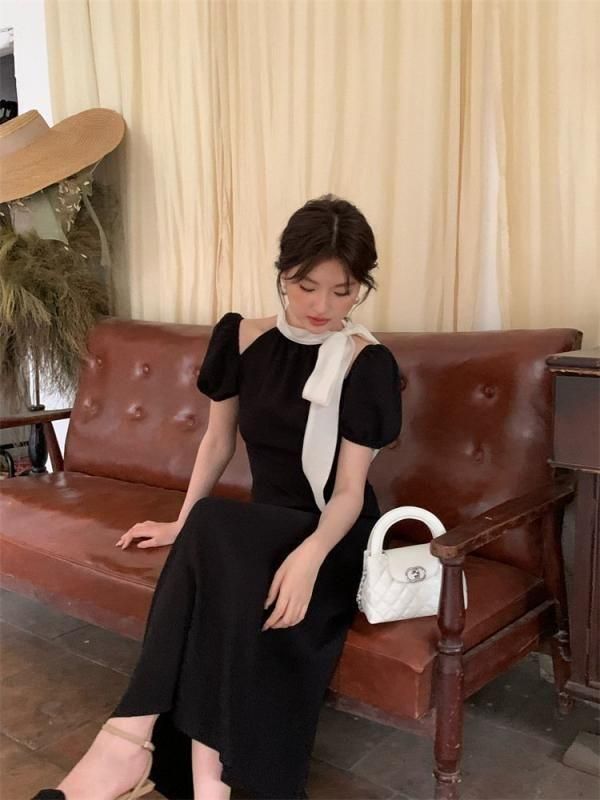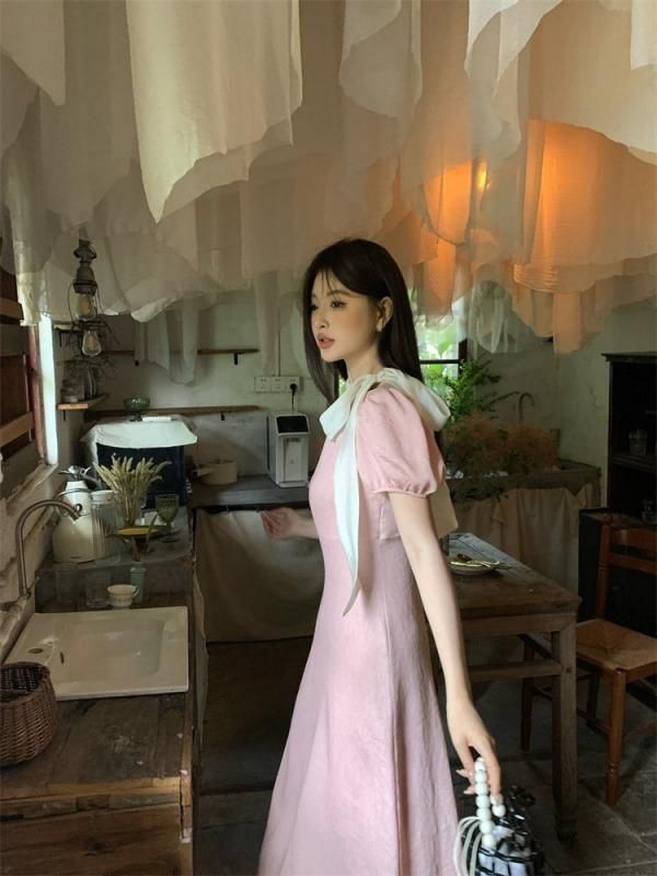 黒、ピンク、緑の3色展開のワンピに白リボンがアクセント。
