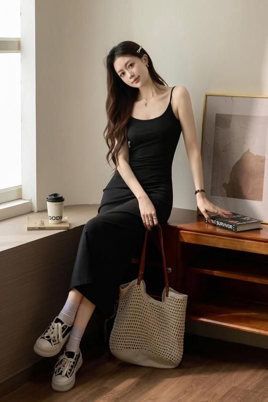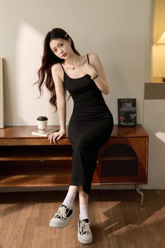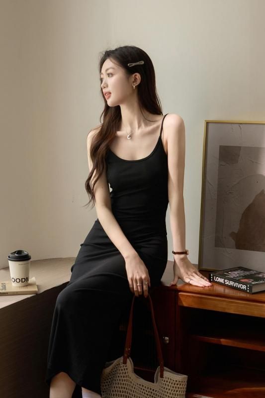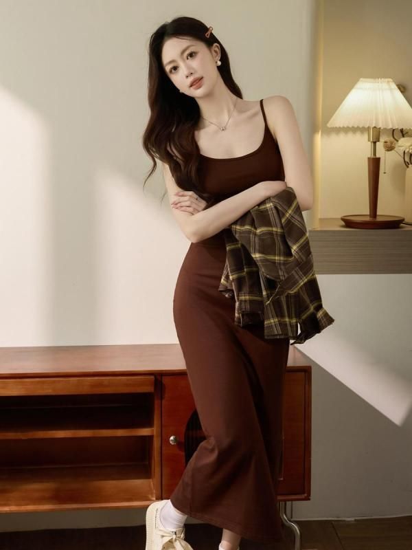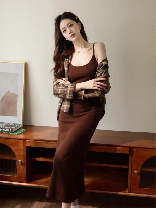 スリムフィットが大人っぽいキャミワンピース 黒 茶